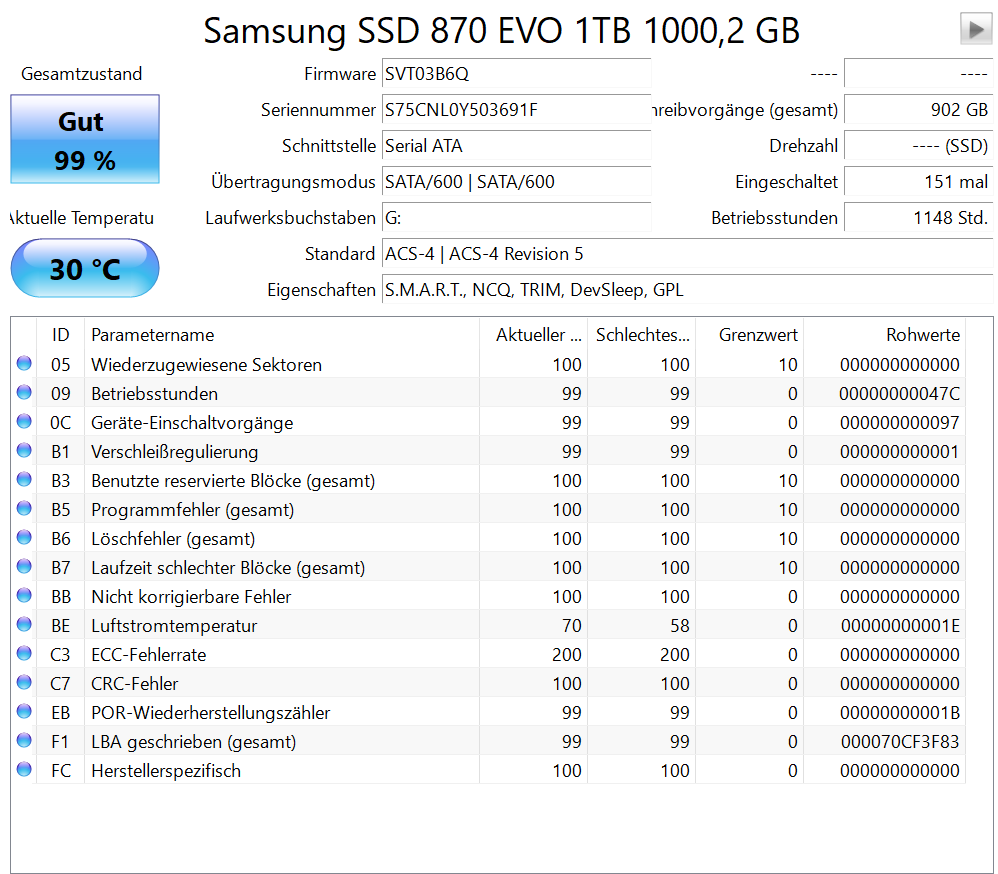 - Beide Laufwerke frisch bereinigt (Secure Erase), S.M.A.R.T.-Werte einwandfrei (s. Screenshots)