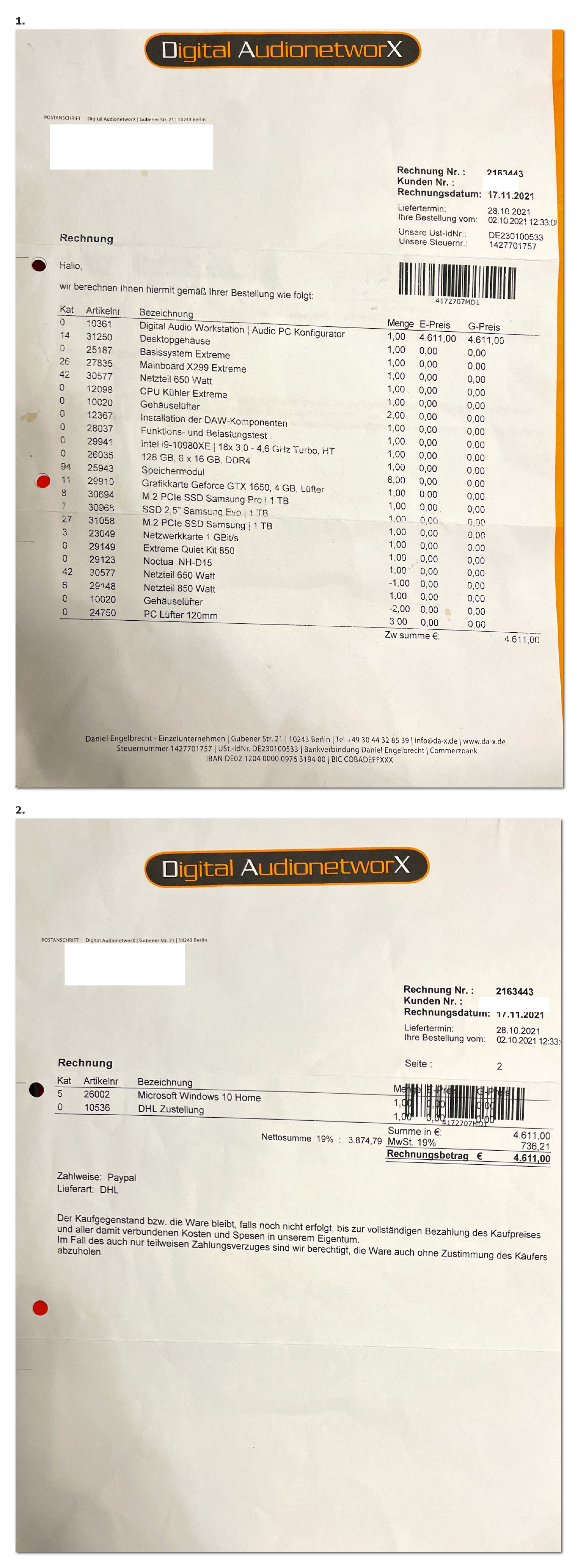 ich verkaufe hier meine professionelle Audio-Workstation, die ursprünglich von Digital Audionetworx (DAX) in Berlin für mich konfiguriert, zusammengebaut und DAX-entsprechend ausgiebig getestet wurde. Das System habe ich im November 2021 für 4,611.00 € neu gekauft (siehe beiliegende Rechnung).