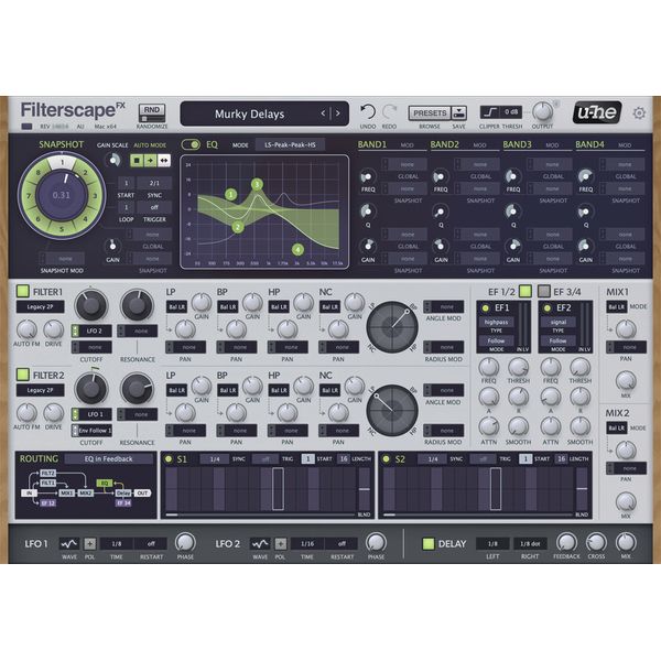 Filterscape FX: bietet vier parametrische EQ-Bänder mit den Modi Low Shelf-Peak-Peak-Hi Shelf, 4x Peak, LP-BP-BP-HP, 4x Bandpass und Panned Bandpass