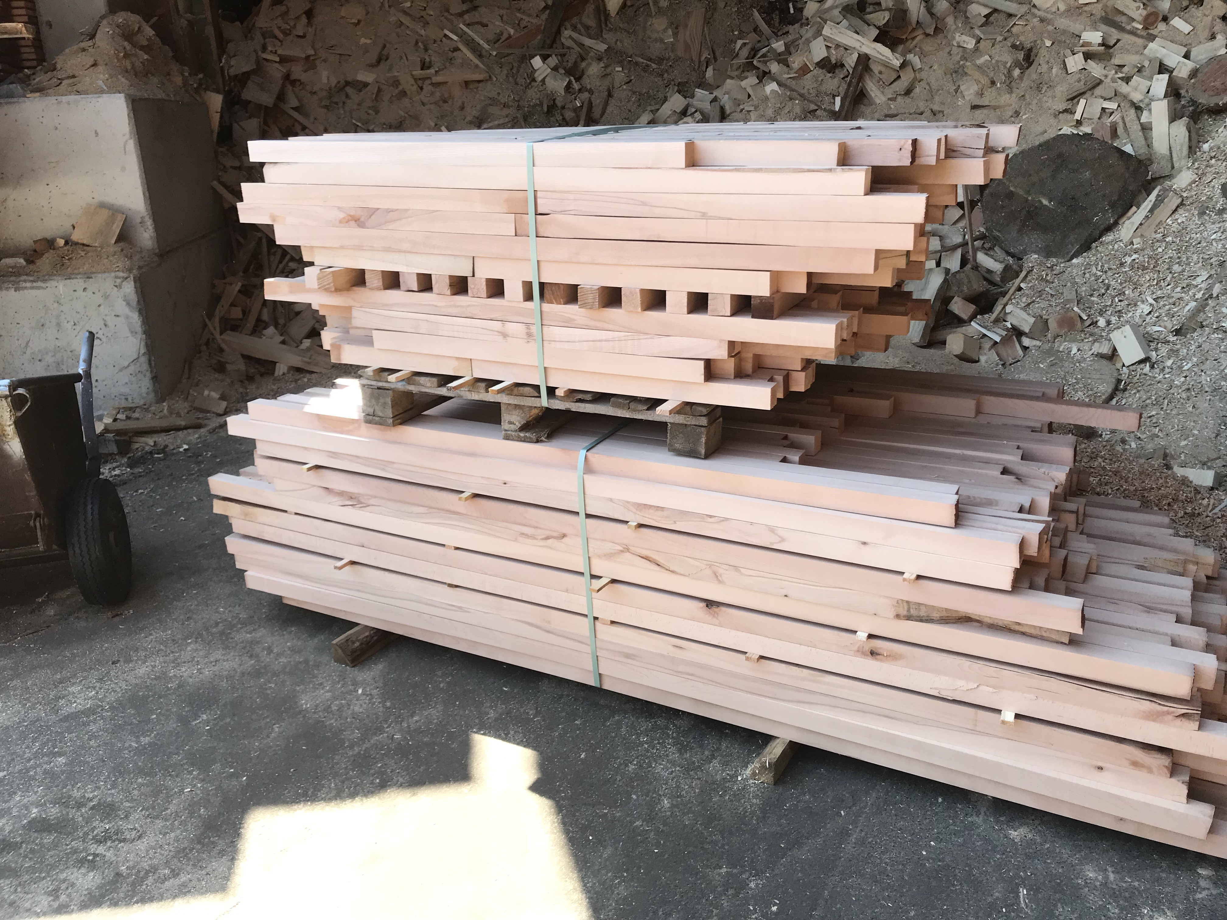 Im Sägewerk Buche Quadratstäbe 50x50 auf 6-10% getrocknet, scharfkantig gehobelt bestellt. Selbst an der Maschine abgeholt, damit die Dinger auch scharfkantig bleiben :)