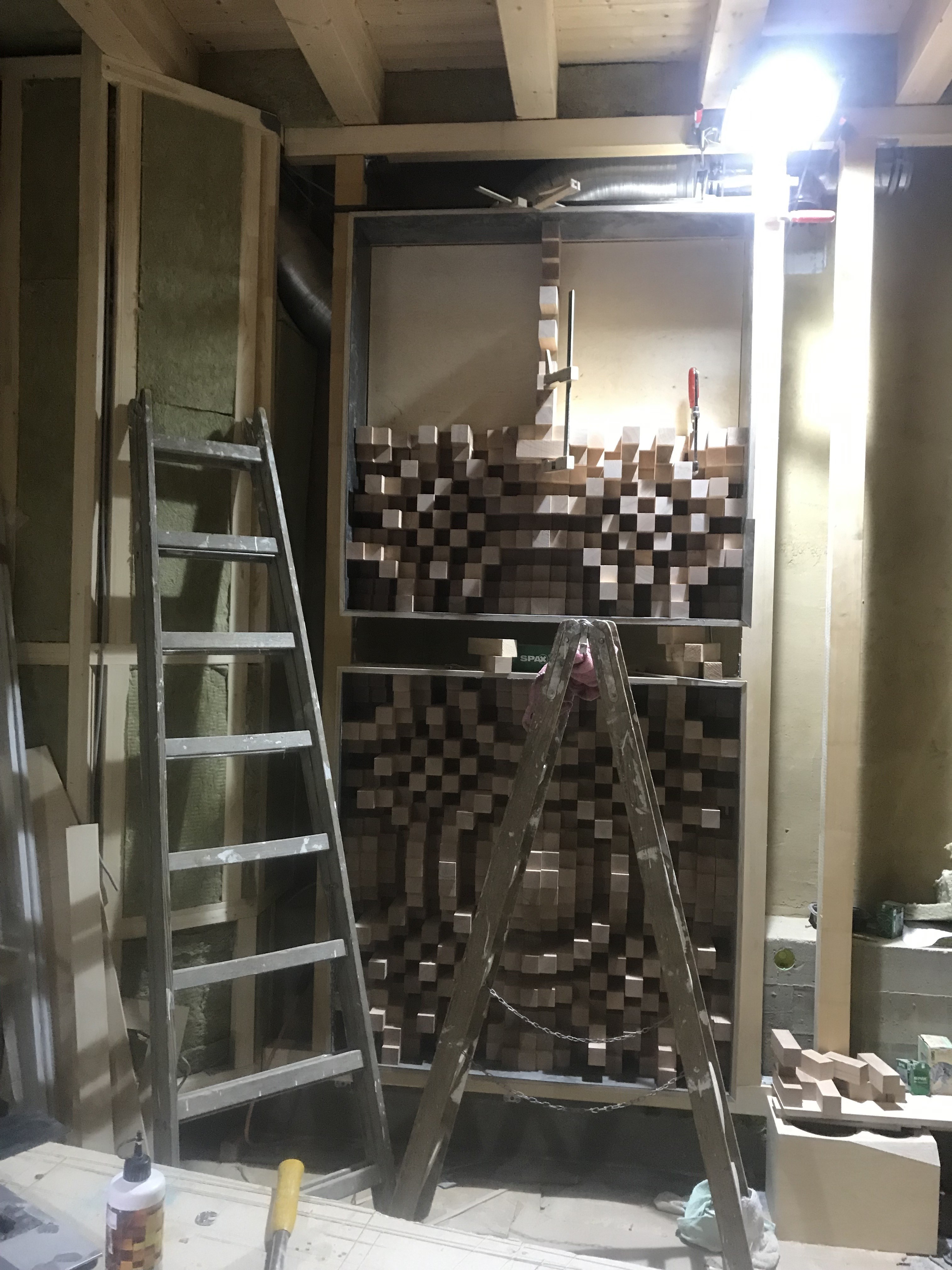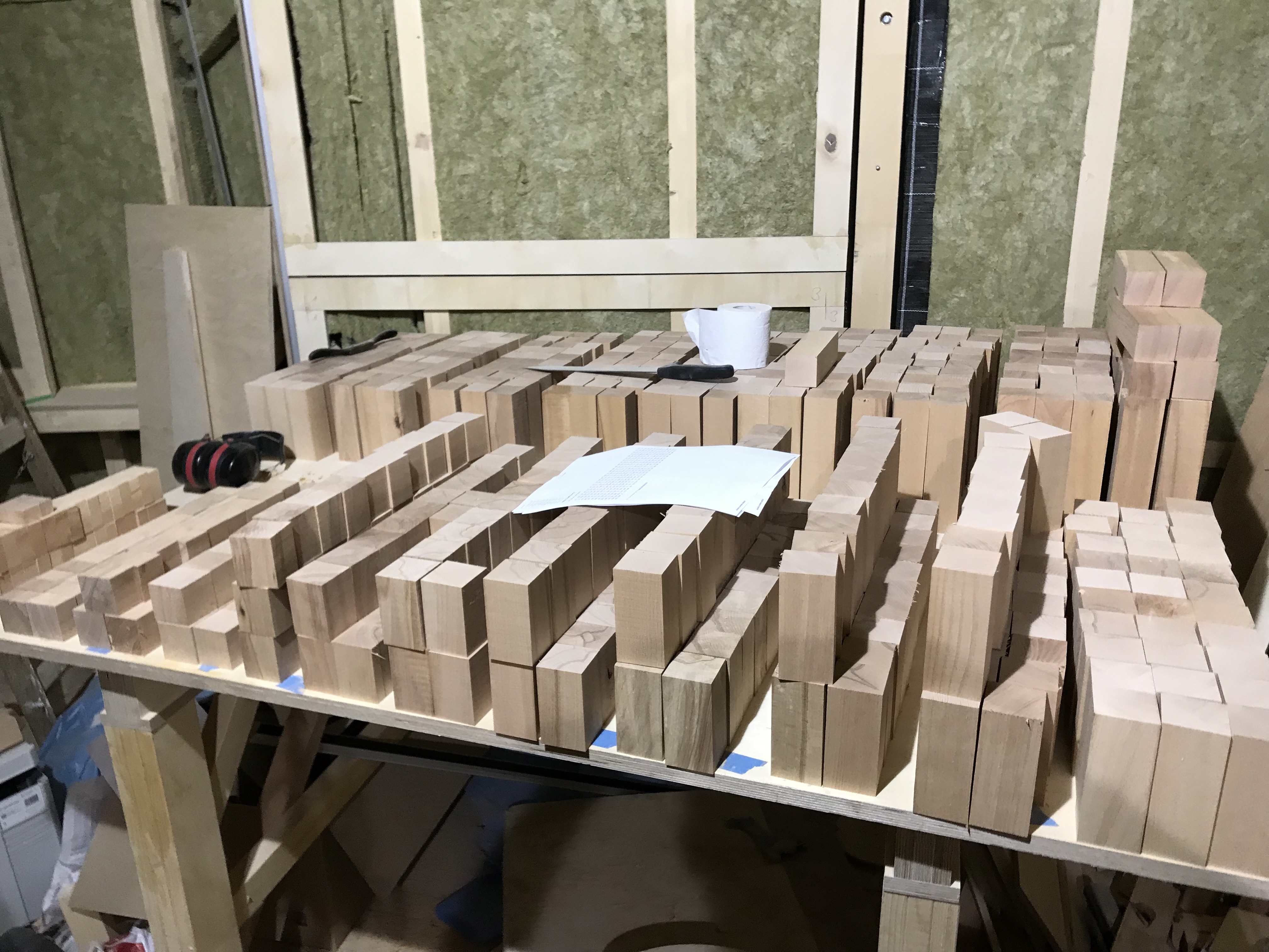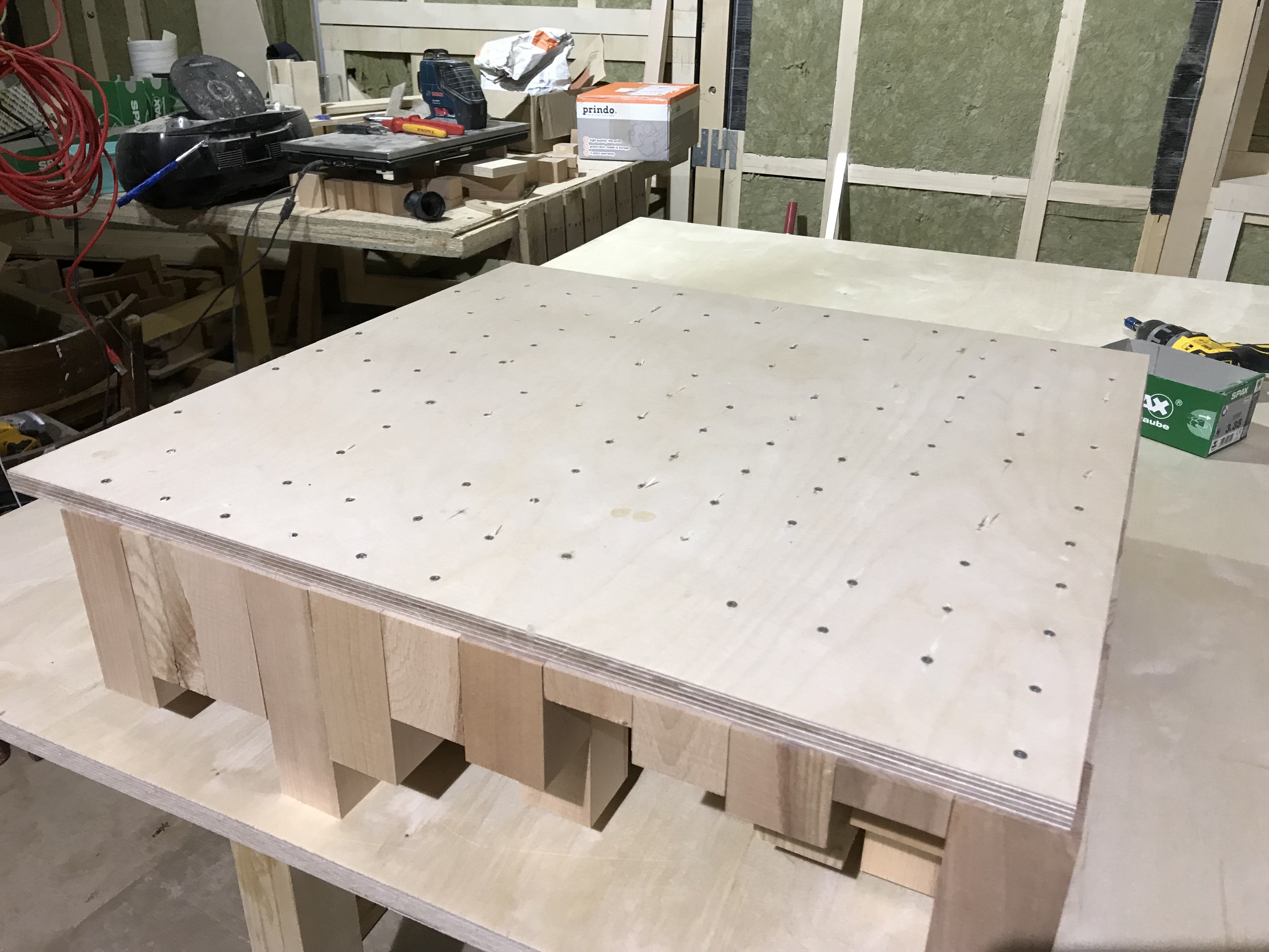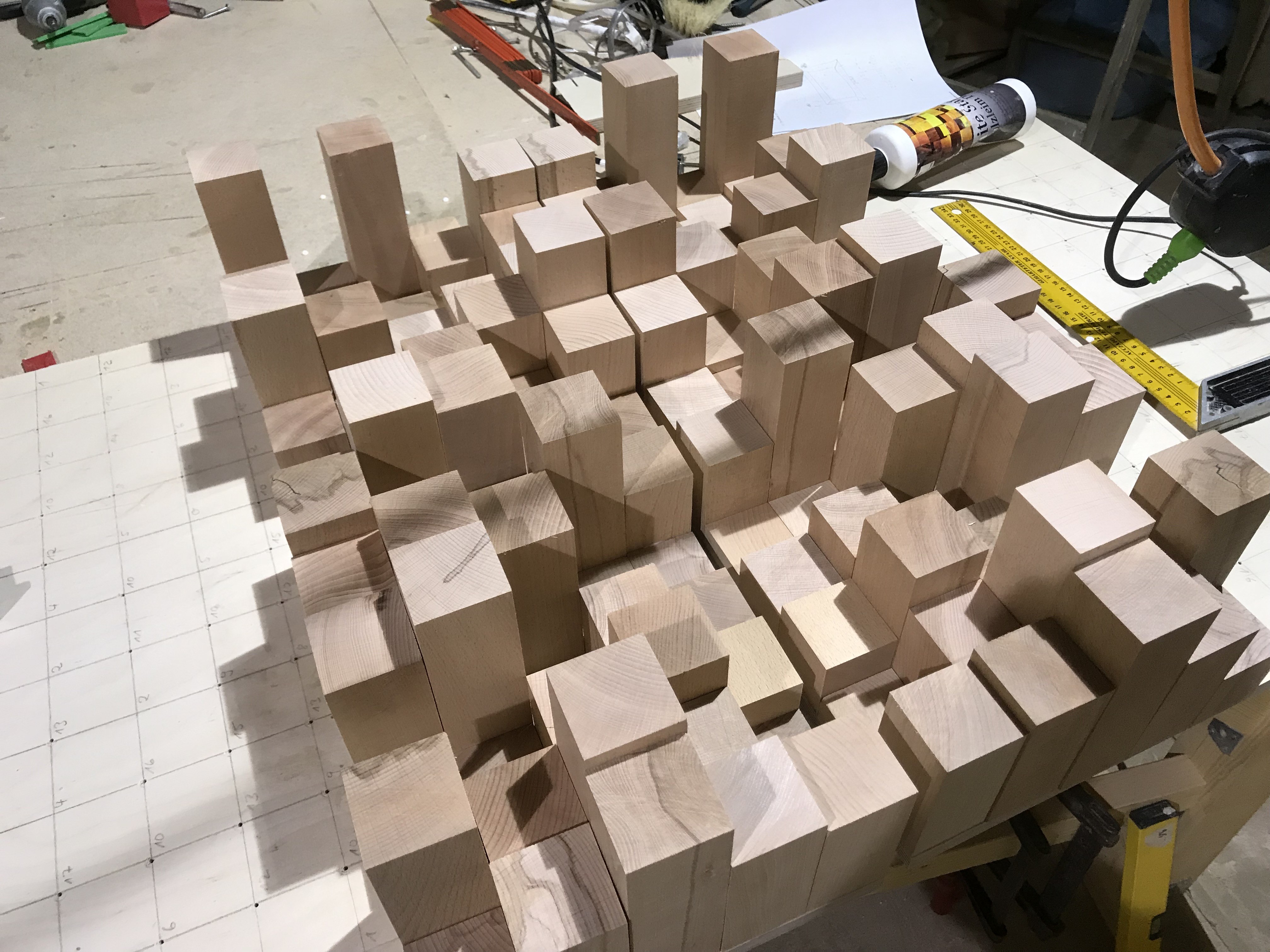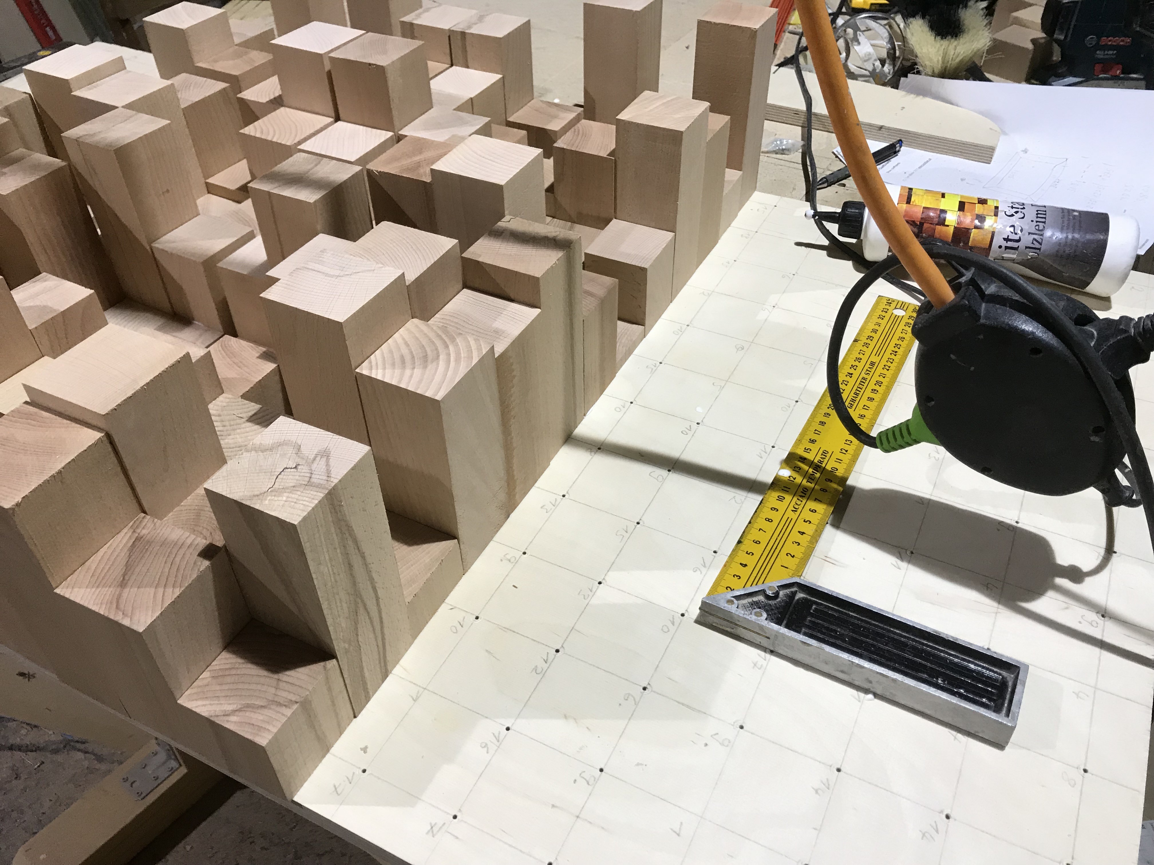 Das Grundbrett 15mm Multiplex Raster aufgezeichnet und jeweils in der Mitte eines Quaders ein 3mm Loch gebohrt, damit später von hinten verschraubt werden kann. Die Quader mit normalem Weißleim verklebt und ausgerichtet. Witzig war, das auf dem im Internet bestellten