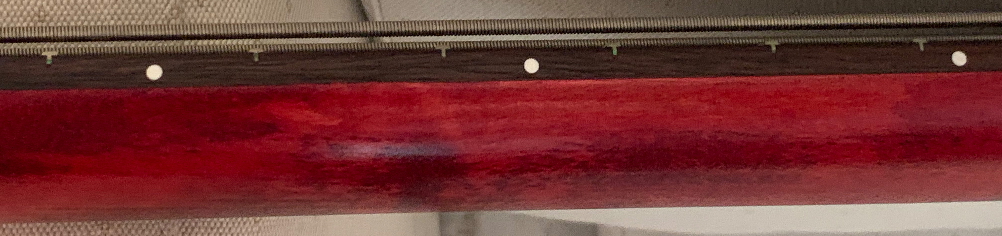 Bei deiner Gitarre kommt noch dazu, dass sie kein Binding hat. Damit müssen die Seiten des Palisandergriffbretts lackiert werden. Nun ist Palisander ein ziemlich öliges Holz und Nitro hält darauf schlecht bis gar nicht. Daher werden bei solchen Gitarren die Griffbretter auch vor dem Lackieren chemisch behandelt und die Öle entzogen, damit es überhaupt geht.