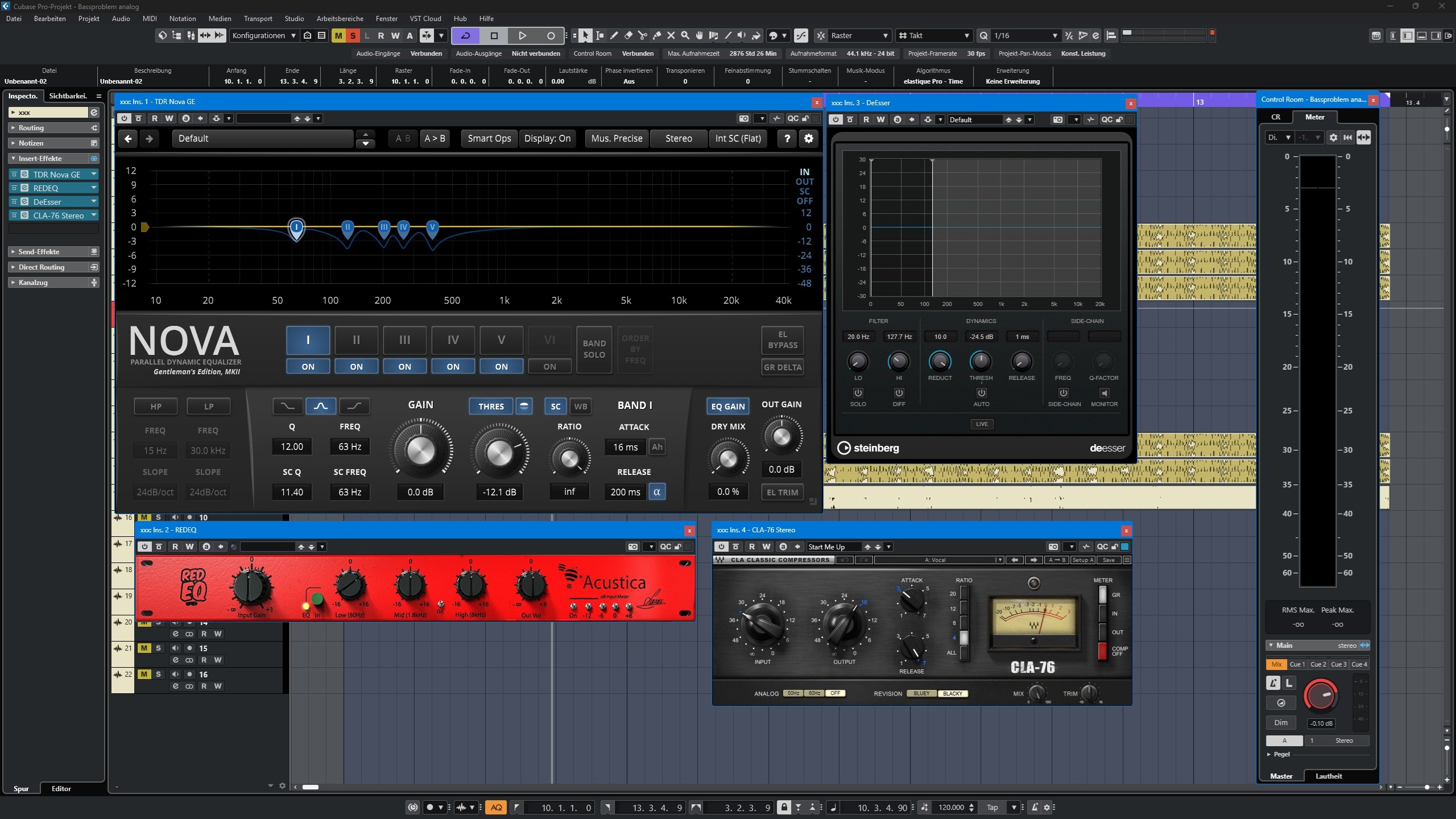 Mit dynamischen EQ Nova aus den höheren Noten die Tiefen raus , danach mit einem Lowshelf im gesamten Tiefen rein, danach den Cubase Deesser (die Bandbreite ist frei einstellbar) den kritschen Teil komprimieren lassen (die Bassenergie wird dadurch gleichmäßiger) und am Ende ein 1176er als finalen Kompressor.Anhang anzeigen 164169
