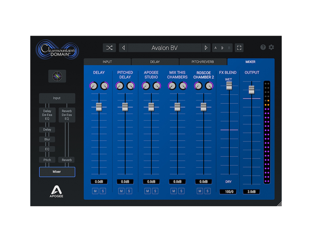 Klassische Presets ermöglichen die Nachbildung der klanglichen Umgebungen bekannter Clearmountain-Mixe. Erweiterte Ansichts-Tabs geben Einblicke in Clearmountains Technik und jahrzehntelange Expertise, was Nutzern ermöglicht, eigene musikalische Mix-Domains zu erstellen. Maßgeschneiderte Impulsantworten von Clearmountains bevorzugten Räumen bieten Zugang zu dem Reverb, das auf zahlreichen Hit-Aufnahmen verwendet wurde. Der mehrfarbige FX-Visualizer zeigt die Platzierung aller Effekte in Echtzeit an. Clearmountain’s Domain ergänzt Apogees Plugin-Angebot, zu dem auch die einzigen offiziell lizenzierten und von Pulse Techniques unterstützten Pultec-EQ-Plugins gehören.