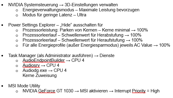 Mit ein Hauptproblem ist, dass Win 11 im Zusammenspiel mit den i9 der neuern Generation die Kerne schlafen schickt und das Aufwecken zu Latenzen führt. Dafür den Power Settings Explorer runterladen und die o.g. Änderungen durchführen. Dafür würde ich ein eigenes Energiesparprofil anlegen. Auch die Audioprozesse im Taskmanager explizit anderen CPUs zuweisen hilft, weil die sich sonst auf den Kernen 0 und 2 mit anderen Diensten in den Weg kommen können.