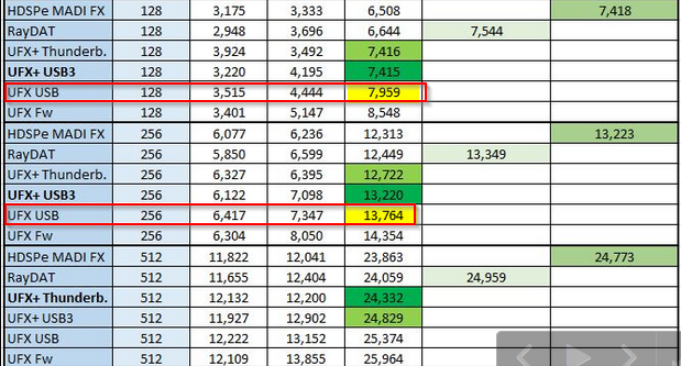 Bei RME (UC verwendet auch den alten USB Treiber von RME wie das UFX, insofern werden die Werte ähnlich sein):