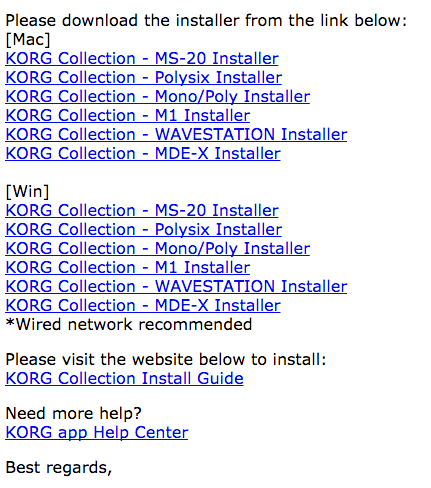 Siehe Bild, das sind Installer-Links die ich per Email bekommen habe nach dem “Kauf” auf der neue Korg Seite.