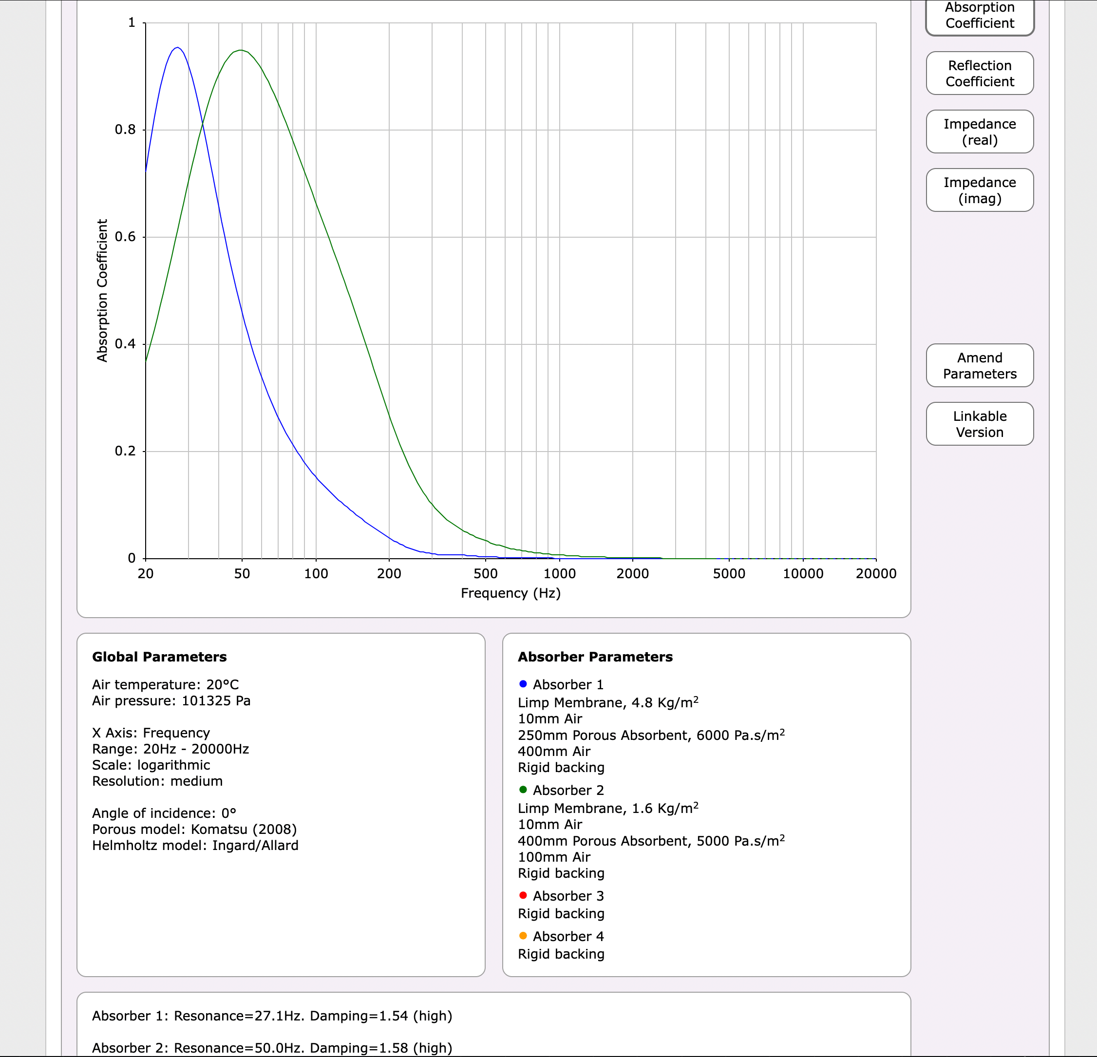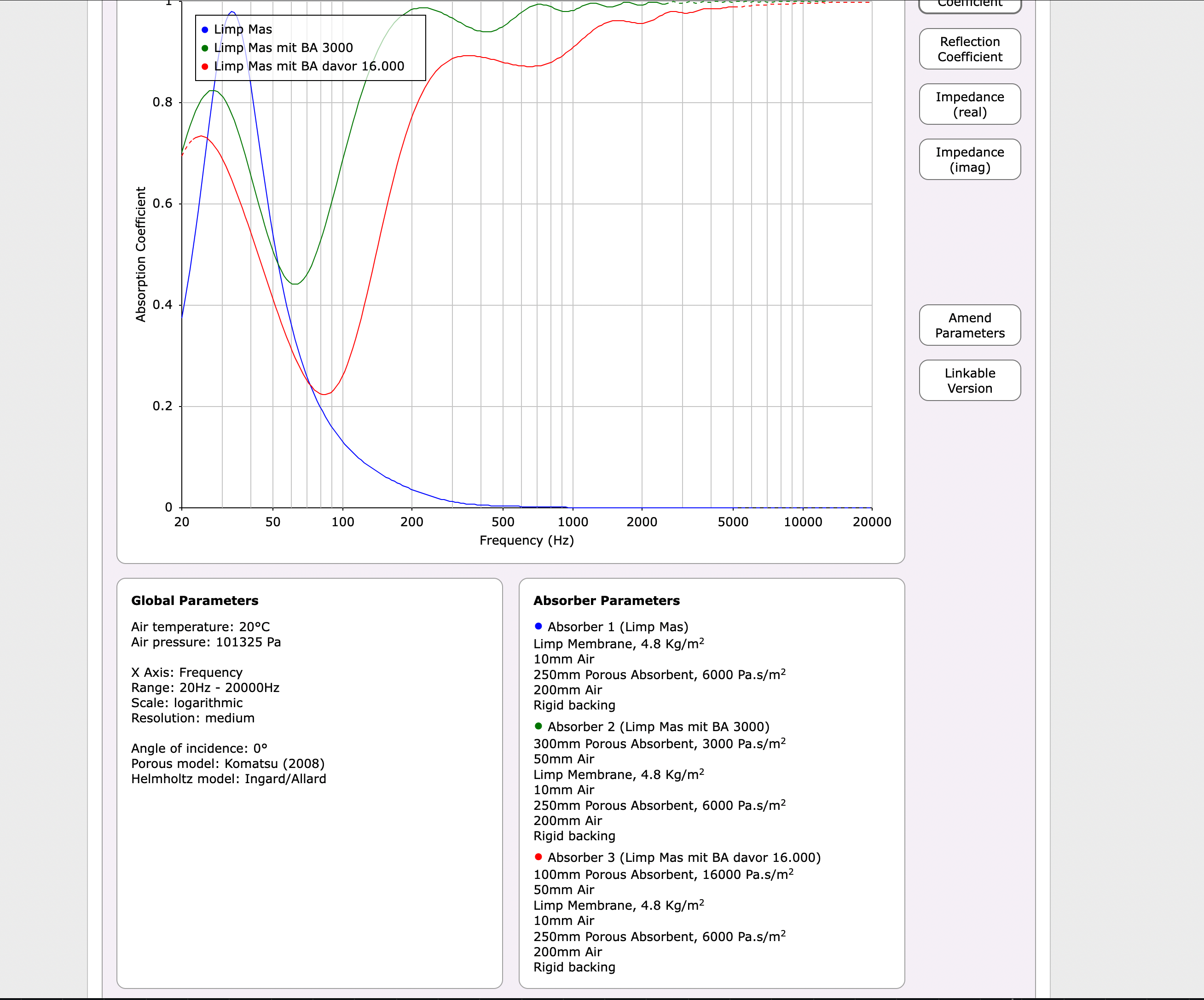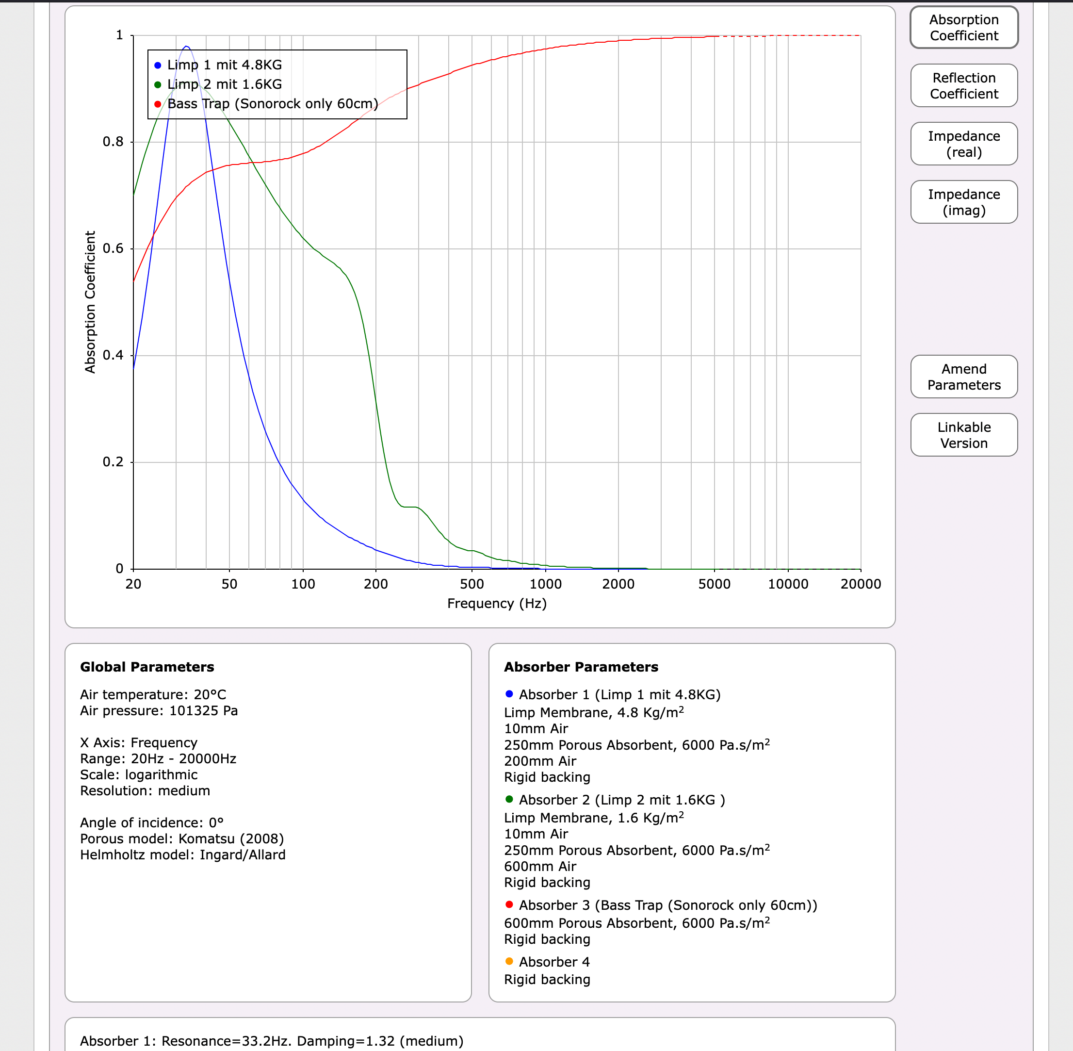 Wenn allerdings zur Behandlung der ersten Grundmode zwischen Vorder und Rückwand die gesamte Rückwand voller LMA's steht, hat man hier nichts für ER's. Ich wollte dich schon fragen ob dies sich gegenseitig negativ beeinflusst bzw. ob man kombinieren kann und hab das dann einfach mal in dem Pouros Absorber Calculator simmuliert. Heraus kam, dass egal wie dünn, dick oder mit welchem Strömungswiderstand man einen Breitbandabsorber vor einem Limp stellt mit 1-5cm Abstand, die Absorbtionsleistung erheblich beeinträchtigt wird.. Die Resonazfrequenz verschiebt sich und die Leistung nimmt ab.