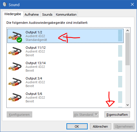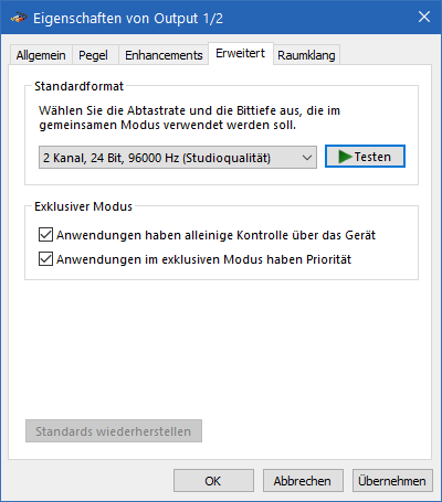 Wenn du Systemsteuerung\Hardware und dann Sound aufrufst, kann man dort das iD (Output 1/2) anklicken, auf den Button Eigenschaften klicken, dann Reiter Erweitert aufrufen und dort mal schauen, was angehakt ist.