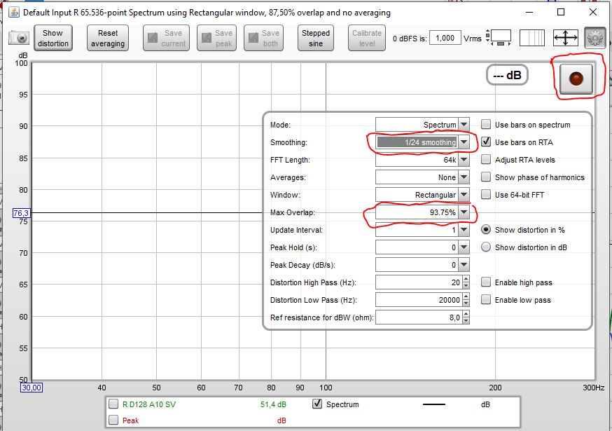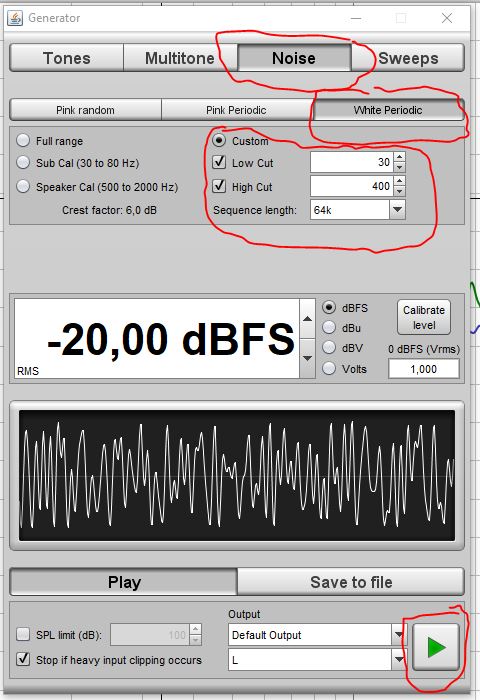 White Noise Periodic limitiert von 30 bis 400 Hz auf die Boxen geben. dBFS Level und Inputs nach deinen Einstellungen (so wie du das halt eingepegelt hast für die Messungen)