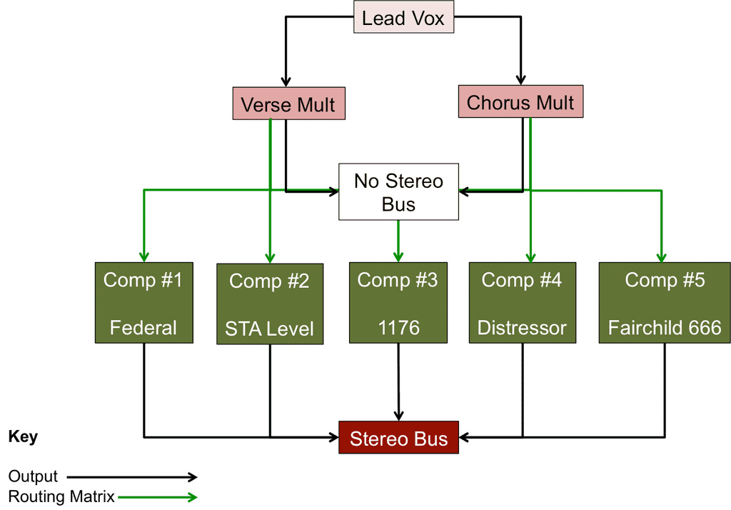 Ich verstehe die Grafik so, dass die Vocals in einen Auxtrack (Gruppenspur) geroutet werden, diese aber keinen Output hat, d.h. von dort kein direktes Signal zum Mixbus geht.