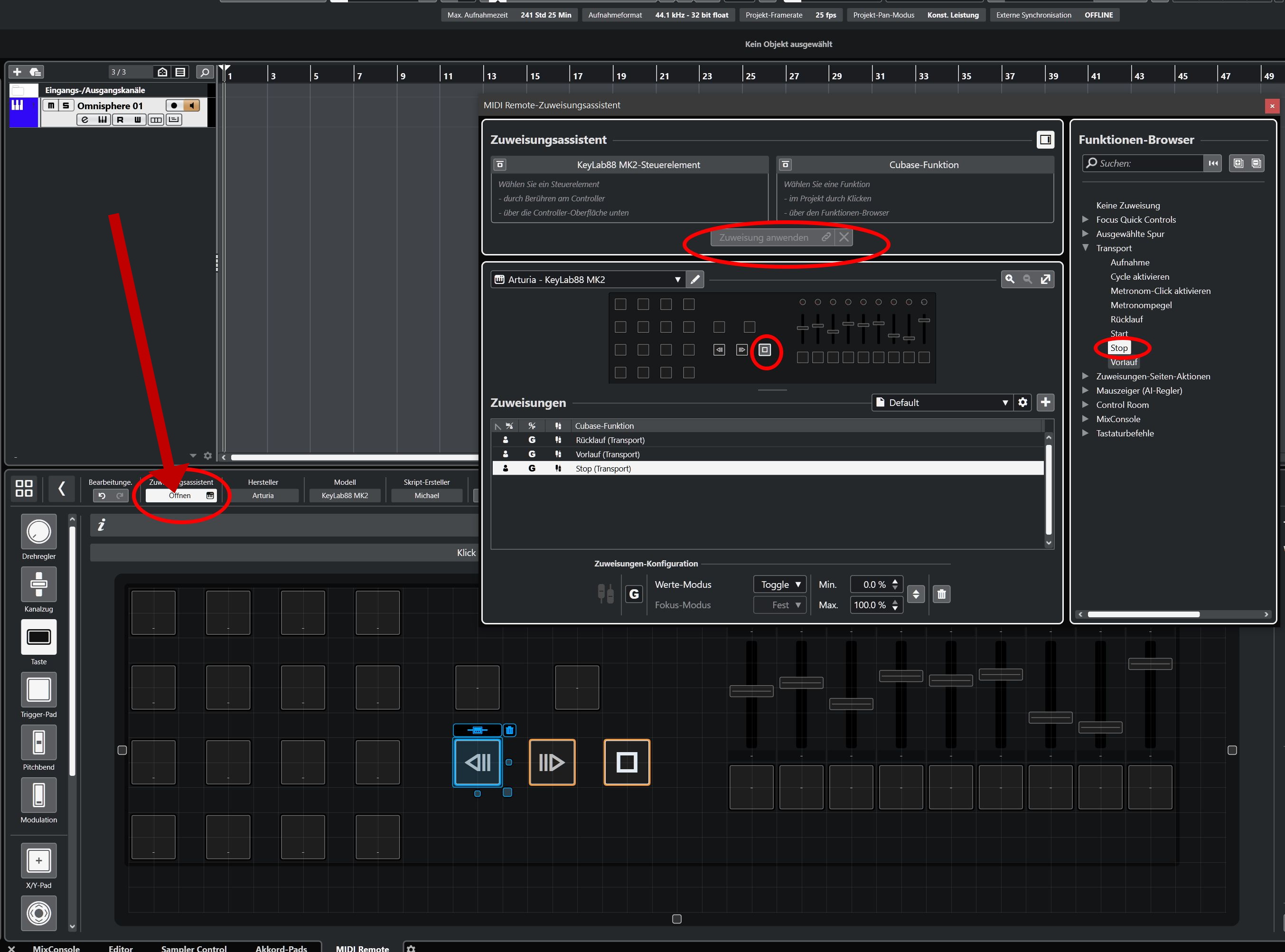 Was ich allerdings noch nicht geschafft habe ist das Transportfeld hinzuzufügen. Abgesehen von dem Wiederholen-Button (im Screenshot unten gerade aktiv neben den Triggerpads) senden diese Buttons keinen Befehl, der den Editor dazu bewegt, einen Button hinzuzufügen.