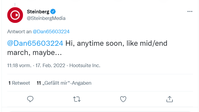 According to Steinberg’s twitter, Cubase 12 is coming “mid/end march, maybe…” https://twitter.com/steinbergmedia/status/1494254881041002496?s=21forums.steinberg.net