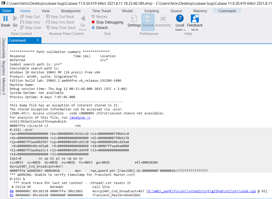 Wenn es ein Plugin ist, sieht es beim Crash im Falle von VST's so aus, dass im unteren Falle "Transient Master" schuld ist. Wenn keine Plugins aufgelistet sind kann der Absturz aber auch irgendwoanders auftreten (z.B. Treiber Audio-Interface, Windows, Cubase Bug ...) . Du kannst auch solche Logs an den Steinberg Support senden, die können im letzterem Falle eher was damit anfangen.