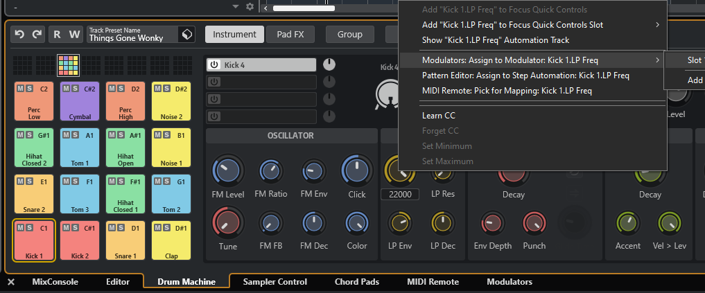 Ist diese Drum Machine nicht irgendwie ein Spin-Off von Groove Agent, was in der unteren Region geladen werden kann oder ist das was völlig eigenes?Die von Dir geannten Dinge sind in der Drum Machine, nicht im Pattern Editor. Der Pattern Editor ist ein wenig ein MIDI-Editor und kann nicht moduliert werden (wie eben auch der Key- oder Score-Editor).