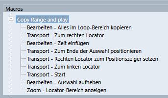 Der Locator-Bereich wird hinter sich selbst kopiert, um das Original und die Kopie wird ein neuer Loop-Bereich gesetzt, dann startet die Wiedergabe und dazu wird der neue Locator-Bereich noch horizontal gezoomt.