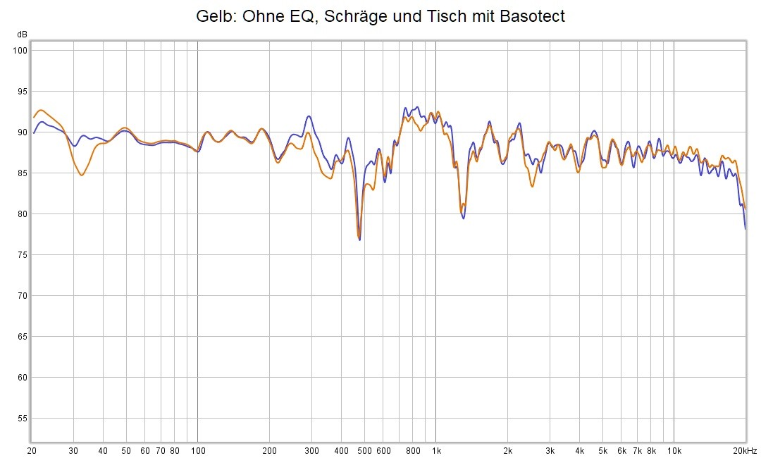 Dieses ganze Projekt samt Verlauf und Raum frisst an meinen Nerven, und das meine ich ehrlich. Jetzt lese ich wieder (wir hatten das schon) von negativen Impulsen, kruden Phasenverläufen und gleichzeitig kämpfe ich mit massiven Löchern im FG. Heute habe ich temporär die Schräge mit 3 Platten Basotect 100 versorgt, den Tisch komplett mit Basotect 100 abgedeckt: Der Erfolg war ernüchternd: