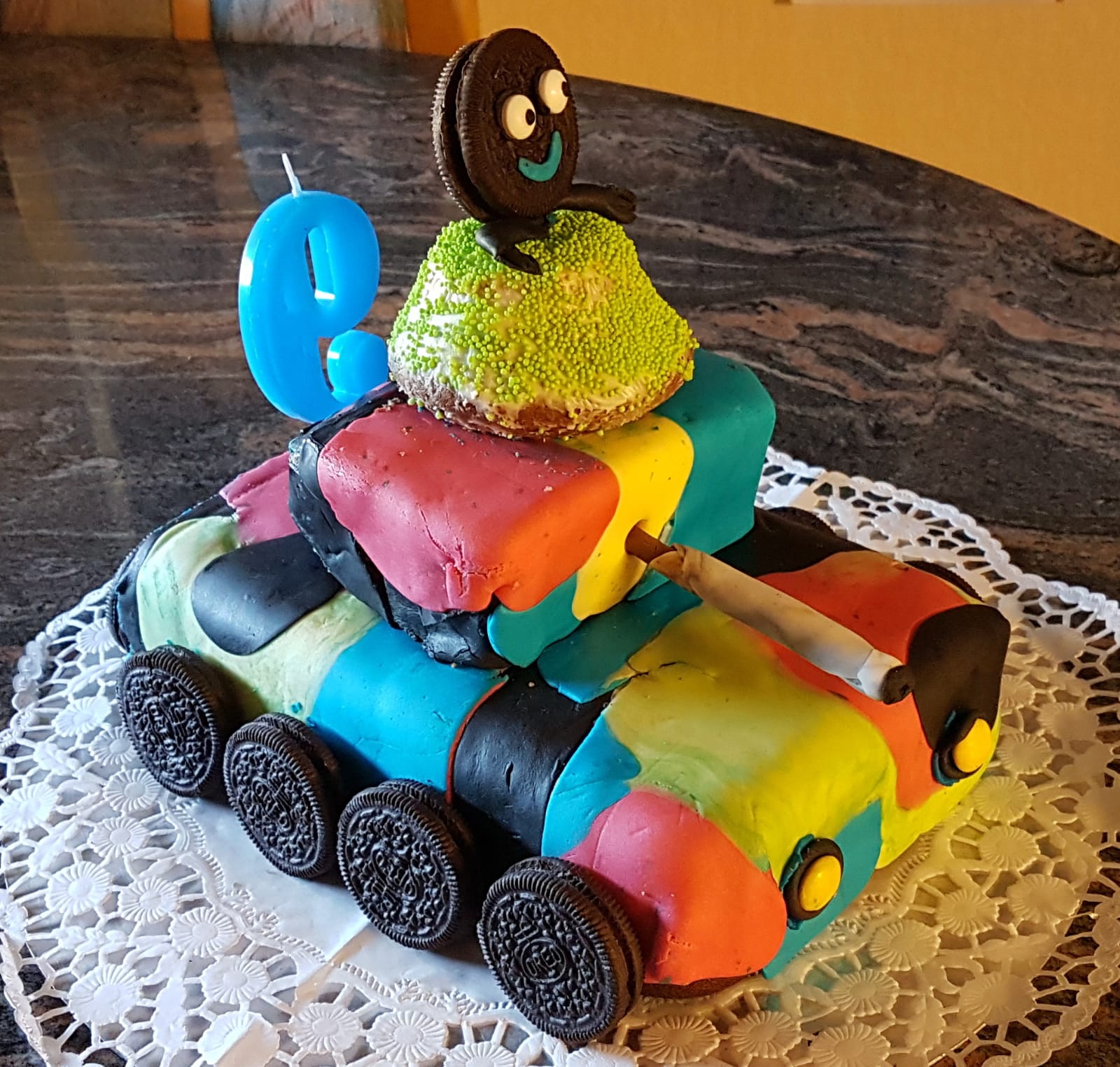 Das Ding finde ich großartig. Panzer in Klimbim-Farben und mit Grinsefigur oben drauf.Die Oma wollte erst ein Piratenschiff zum 9. Geburtstag meines Sohnes backen, er hat aber auf nen Panzer bestanden.