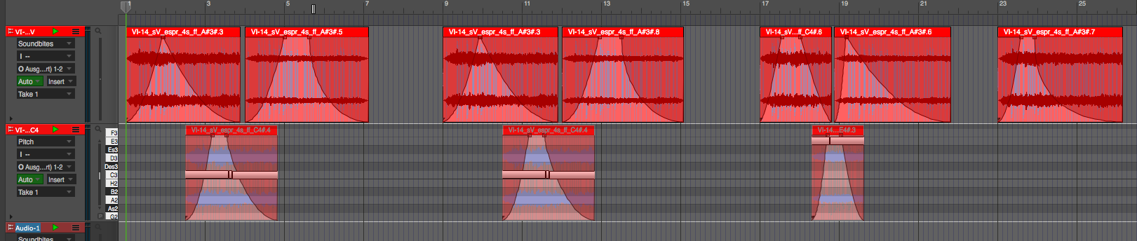 Manchmal bastel ich mir da z.B. aus einem einzigen Sample selbst ein paar Round-Robin-Sachen zusammen, mit unterschiedlichen Anstrich-Längen, Fades, und leicht gegeneinander verstimmten Stimmungen. Da kommt keine noch so aufwändige MIDI-Bearbeitung mit, auch Expressions und Articulations nicht. Sieht dann so aus: