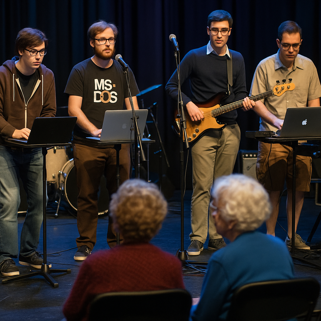 Auf Apple-Rechnern. Blanke Ironie. Die Nerd-Optik dürfte hinkommen. Der 3-Saitige-Zwergenbass gefällt mir. Und das Publikum besteht aus Oma Anneliese und ihrer Freundin aus dem Heim, die nicht schnell genug auf ihr Zimmer flüchten konnten.Also die KI sieht eine Band aus Recordlern so: