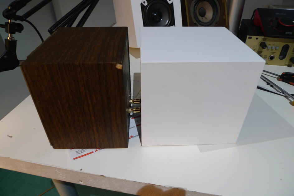 Ich habe im Baumarkt 10mm MDF schneiden lassen für EUR 2,80 oder so. Der Zuschnitt war dermaßen exakt, daß das Leimen mit Ponal Express ein Kinderspiel war. Ich hatte nicht mal Schraubzwingen und habe einfach mit Gewicht gearbeitet. Das hat für beide Teile keine Std. gedauert. Danach hab ich sie mit Billigtiefgrund grundiert, und dann 3 mal mit einer Rolle mit Acryllack geweißt. Der Trick war, einfach "Stumpfmatt" zu nehmen, die Orangenhaut sieht aus als wäre sie so gewollt. Dann ein Ikeakissen zerrissen, die Treiber eingebaut, und beim ersten Hören festgestellt, daß es das nicht ist.