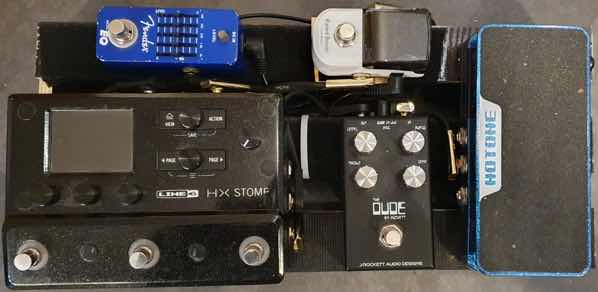 klein, leicht und handlich...Nur mal so, musste ich mir für einen Gig, zu dem tatsächlich hingeflogen wird, schnell zusammenstöpseln. Werde nur einen Patch benutzen, aber mit dem bekomme ich tatsächlich alles hin (Clean, sanfter Drive, mehr Drive und jeweils Lead-Varianten, für'n bisschen Space Delay ist auch noch Platz). Untendrunter ist 'ne DI, von der geht's einmal zum FOH und einmal zu dem kleinen EQ, der kontrolliert mir die Monitor-Lautstärke und wenn Fletcher-Munson zuschlagen sollte, kann ich das auch darüber regeln.