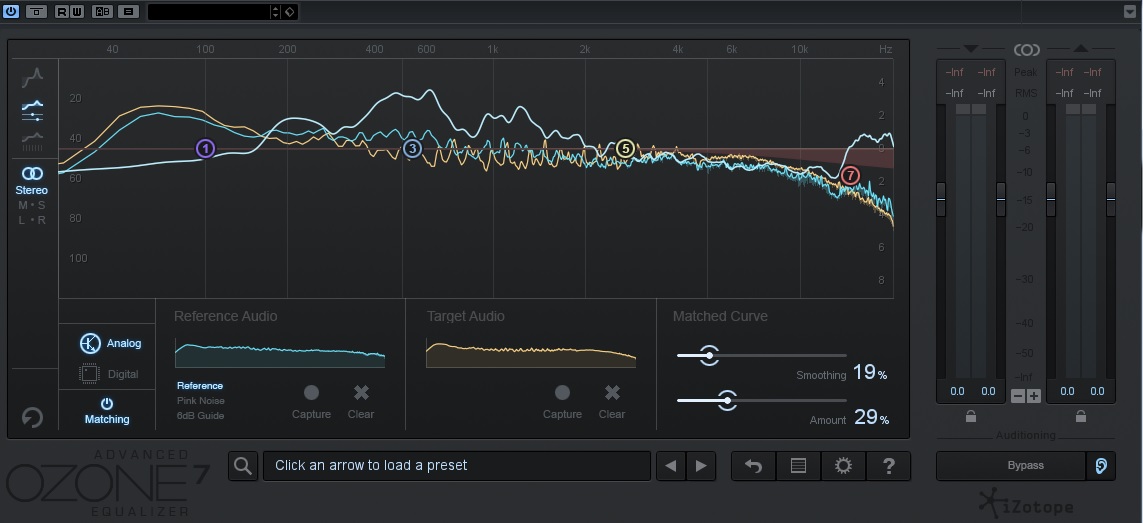 Ich hab auch gleich noch einen Screenshot vom Ozone7 mit beigefügt. Die Blaue Linie ist der Referenz-Song, die gelbe Linie mein Song und die weiße Linie dann der EQ-Verlauf nach dem Matching. Wobei ich, wie man sieht, nur 29% der Matching-Kurve angewendet habe. Außerdem habe ich dann eigenhändig noch, das ist ja auch das Schöne an dem ganzen, im Frequenzband oben wieder etwas zurückgenommen, EQ-Band 7, wie man sieht.