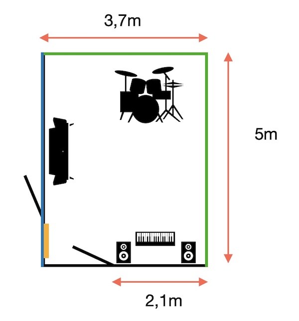 Der Raum ist 3,70 breit und 5m lang. Meine Arbeitsplatz ist leider nicht mittig sondern links neben der Tür in einem Abschnitt mit ca. 2,10 breite.(siehe Bild)