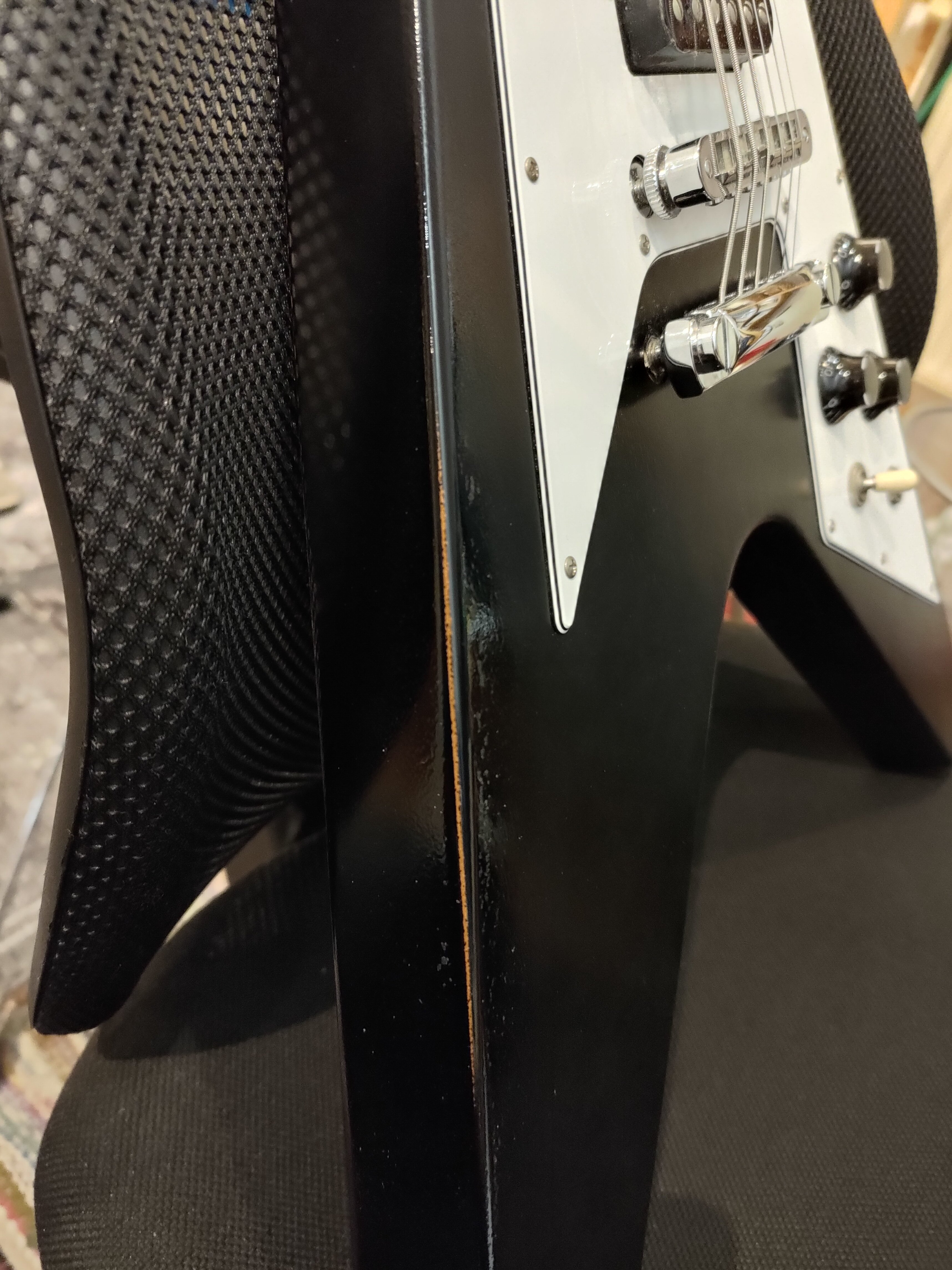 Bei meiner Gibson Flying V reißt mittlerweile der Lack an den Kanten auf. Der Lack ist schwarz aber darunter kommt eine rötliche Schicht (vermutlich Porenfüller) durch. Ziemlich merkwürdig, denn der Lack ist noch Intakt und gar nicht durch. Tja "only a Gibson is good enough".![]()
