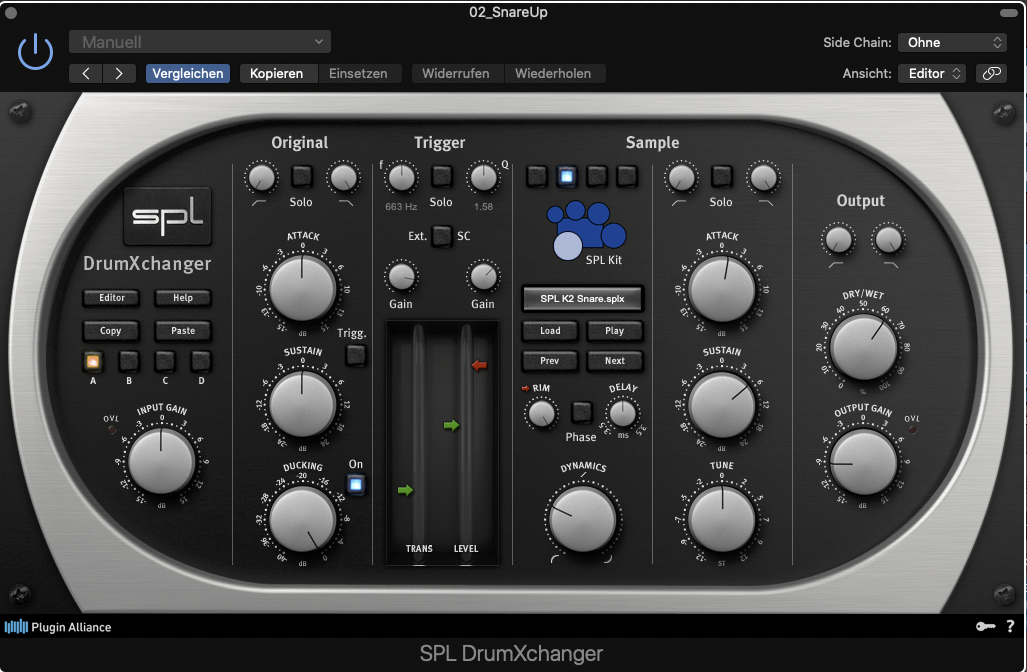 – Bei Snare und den Toms sind Samples 60-70% zugemischt mit SPL Drum XChange (siehe Screens) vorher alles mit Oxford Drum Gate gesäubert.