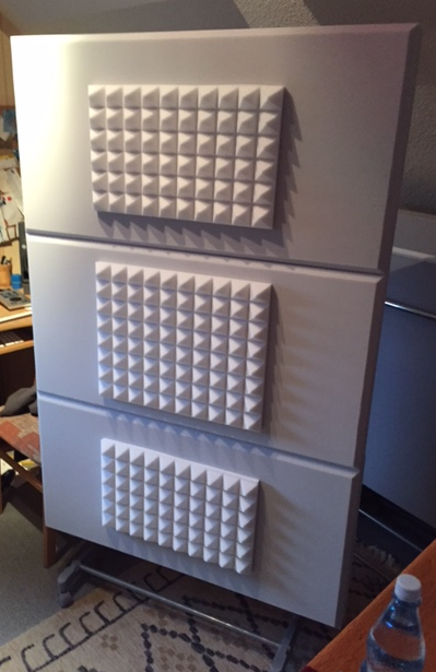Ich lege da jetzt noch eins drauf und bringe eine "Achter" ins Spiel und zwar so, dass der hintere, empfindliche Bereich in den Schrank zeigt, der geöffnet wird und vor den Absorber gestellt werden werden. Das Mikro kommt dann dicht ran, an den Absorber. Damit ist der hintere Bereich der Acht weitgehend schallfrei und die Seite bekommt systematisch weniger ab. Das ist die wahrscheinlich günstigste Anordnung für diesen Mini-Raum. Achter git es als schaltbare GM wie z.B. das AKG C 414. Das bringt so durchschnittlich 3dB mehr Abstand zu den Reflektionen im Raum.