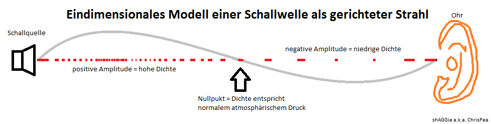 Wenn wir nun dieses eindimensionale Modell, also für unser Ohrloch konzipierte Betrachtungsweise, anschauen, sehen wir, dass auf einer Linie die Dichte der Luft bei einer fixen Frequenz sich periodisch verkleinert (maximale negative Amplitude) mit dem atmosphäreischen Druck ausgleicht (Amplitude im Nullpunkt) und maximal erhöht (maximale positive Apmlitude). Statisch gesehen bewegt sich nichts, nur die Luftmoleküle bewegen sich mal aufeinander zu oder voneinaner weg, aber bleiben statistisch gesehen an ihrem Ort.