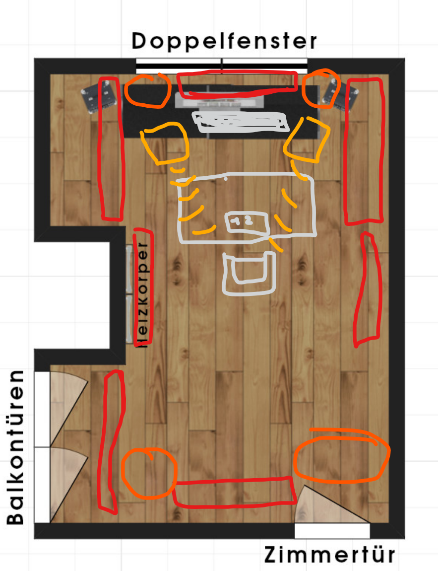 Was ist wichtiger ? Die Raumsymmetrie ? Die Tiefe ? Ist der gegenüberliegende Wand-Heizkörper eher ein Problem wie die Reflexion and den Fenstern ?