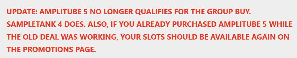 An keiner Stelle wurde "Amplitube 5" explizit von der Qualifikation für den Group Buy ausgeschlossen, es wurde also nirgends kommuniziert: "Amplitube 5 berechtigt nicht zum Group Buy"! Wirklich nirgends!