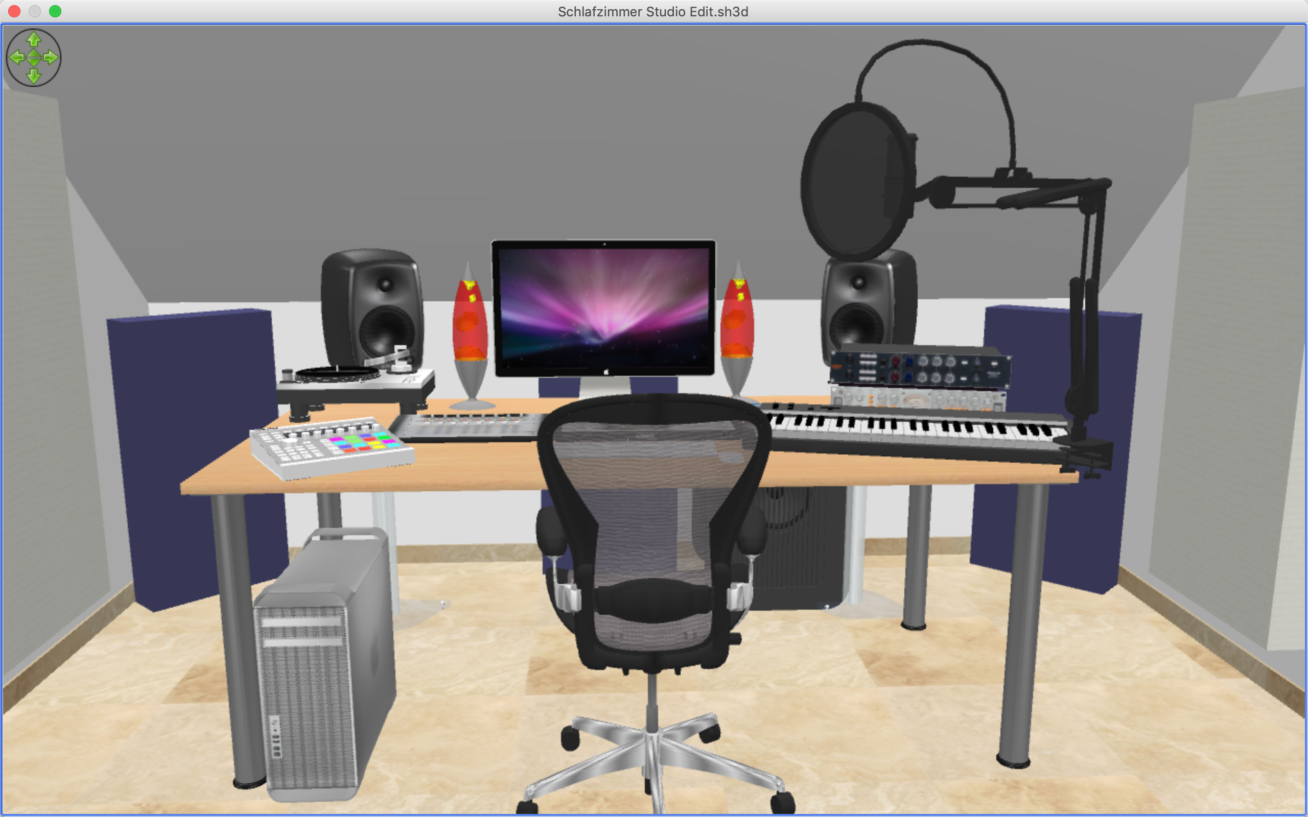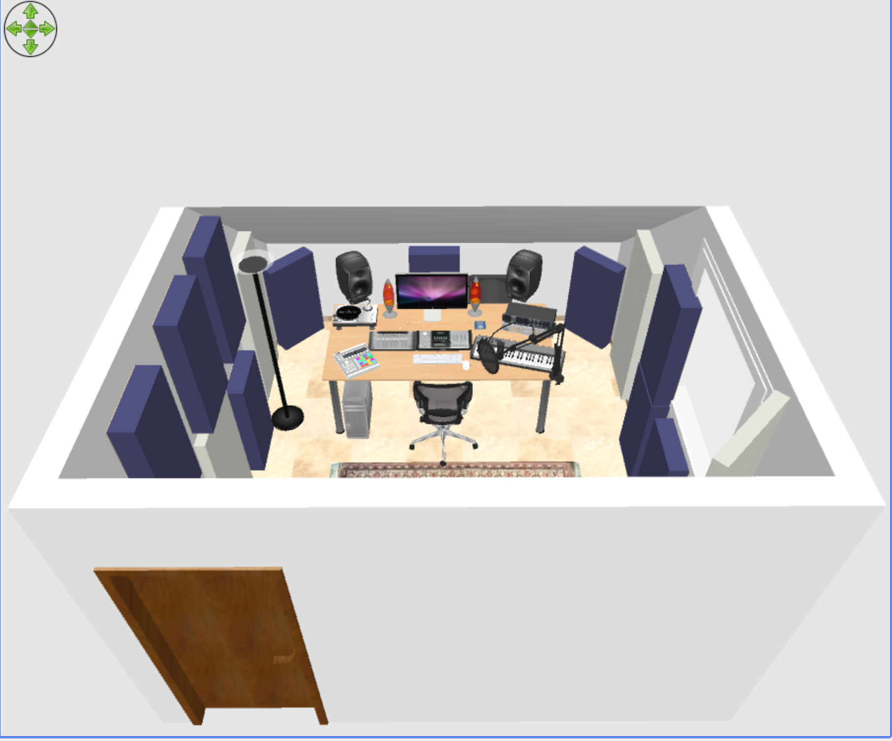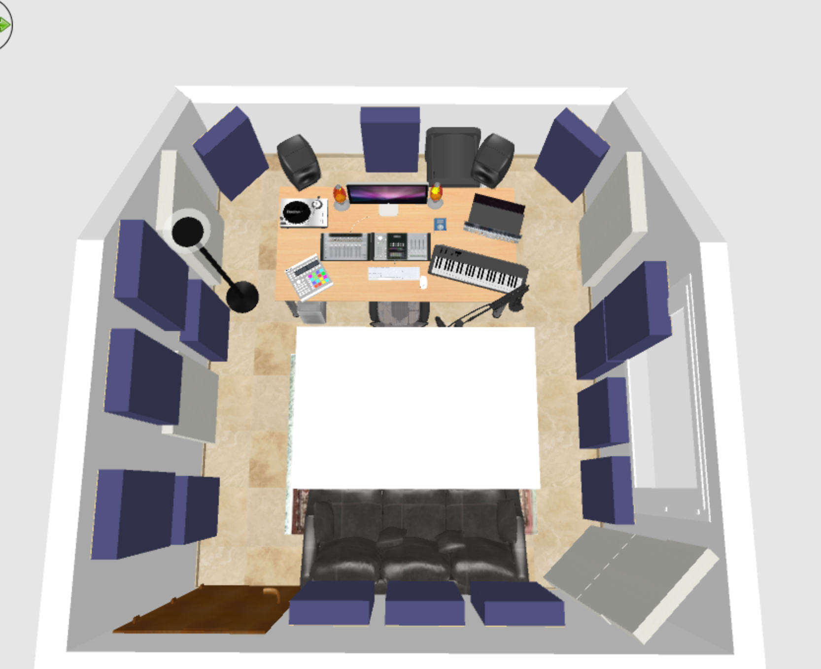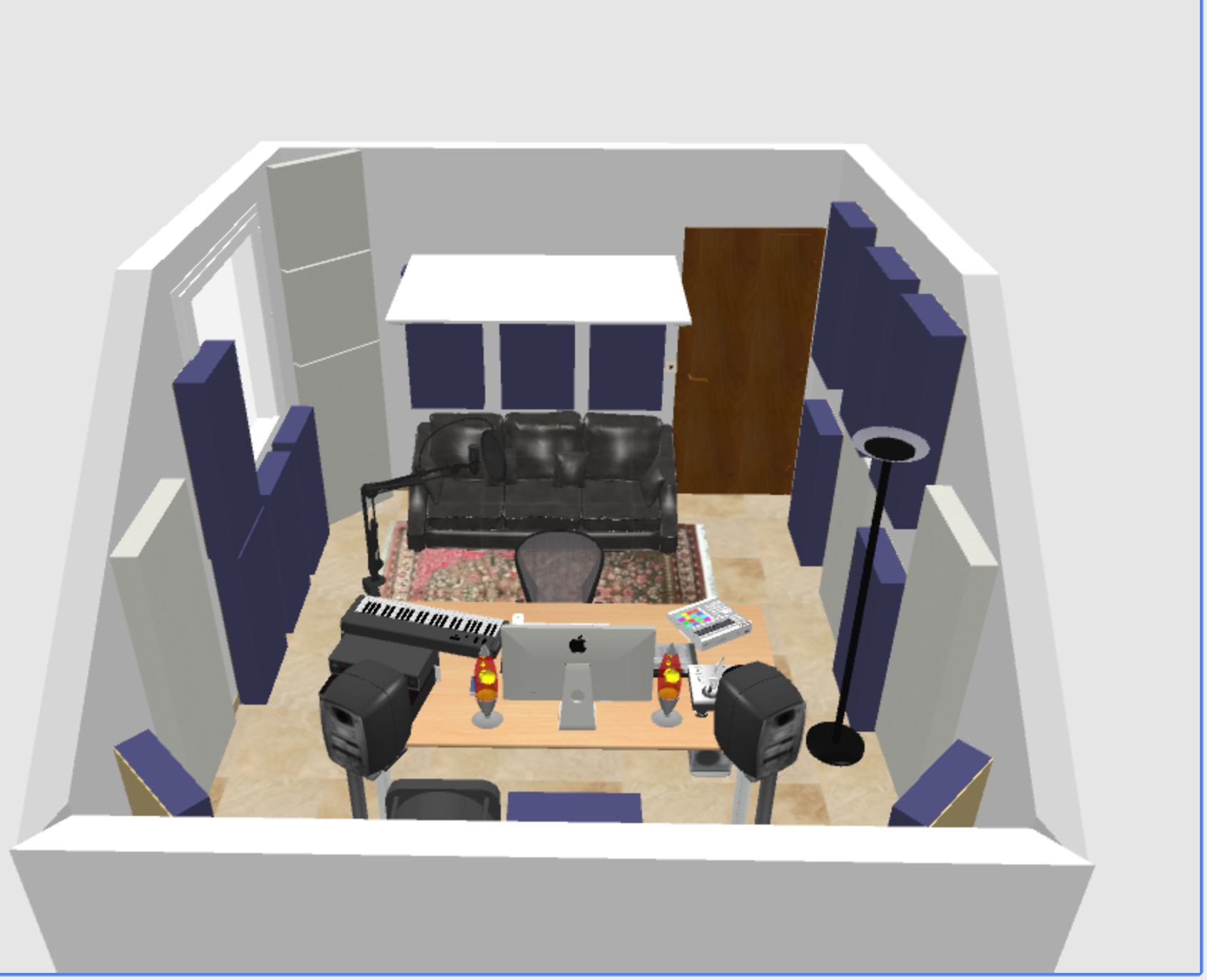 Wie finde ich denn raus was welche Aufstellung der Absorber am besten Sinn ergibt? Durch Trial and Error Messen und positionieren? Dann hätte ich aber ein dutzend Löcher an Wänden und Decken.. Absorber in die Ecken ist ja denk ich mal grundsätzlich nicht verkehrt und Erstreflexionspunkte an den Seitenwänden habe ich mit dem Spiegeltrick bedämpft (glaub ich zumindest). Leider versperrt mir die Türe eine Ecke des Raumes, wo ich quasi keine Absorber anbringen kann. Hier mal eine Skizze und 3D Bilder als Beispiel: