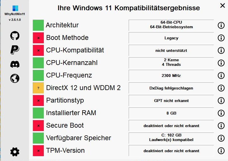 Ich habe also eben einen Screenshot der Ausgabe von WhyNotWin11 gemacht. Das ist aber von meinem Notebook - mein Desktop-Rechner kann mehr.