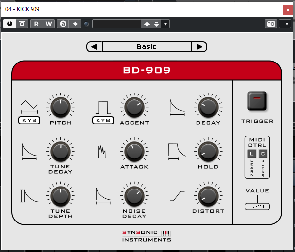 Ich habe mal diesen kostenlosen Kick 909 Generator mit den folgenden Einstellungen benutzt: