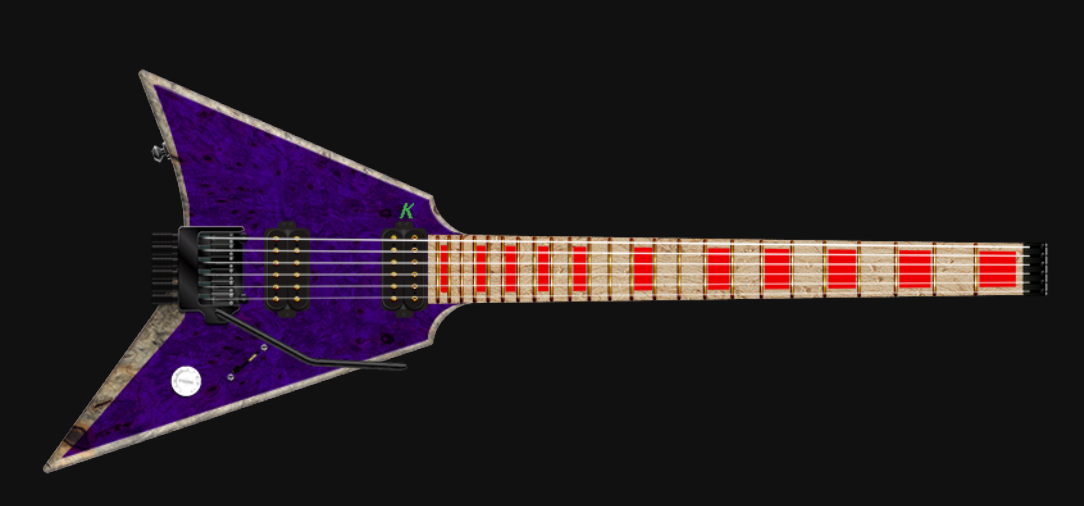 Mit einem großen Totenkopf-Motiv auf der Frontseite des Korpus wäre sie vielleicht noch maximaler hässlich. Aber es ist schon nicht schlecht, muss ich sagen. Vor allem die knallroten Bundmarkierungen sind exquisit. Wären die nicht, könnte man es sogar für einen ernsten Vorschlag halten. Aber so ist der Kirmes-Faktor doch sehr hoch.Ich habe jetzt noch mal eine konfiguriert, auf dass sie maximal hässlich sein mag.