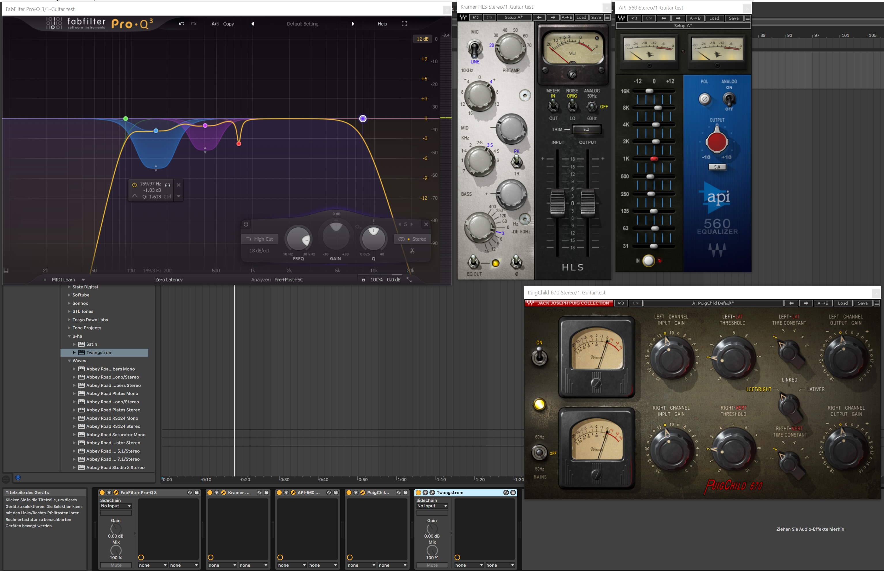 Ich finde selber kaum färbende bis besser nicht färbende Kompressoren auf AGuits stets vorteilhafter. 1176 blue und LA2A erzeugen mehr oder minder Obertöne, seriell verschaltet addieren sich diese Obertöne auch noch. Kann nett sein, muss aber eben nicht. Eine AGuit hat ja von vornerein genug feine Obertöne, die man nur entsprechend herausarbeiten muss.