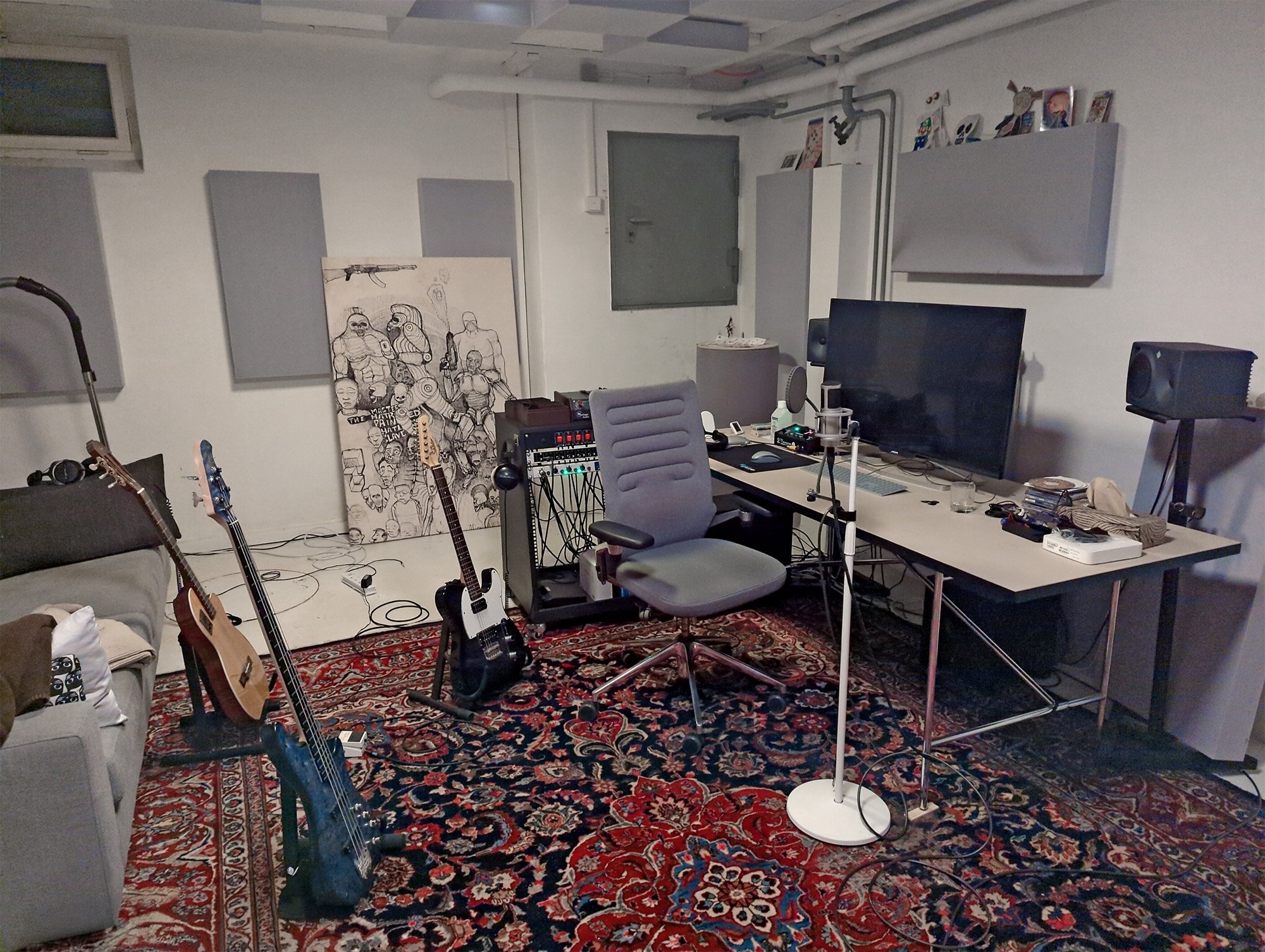 Aktuell bleibe ich manchmal mit dem Stuhl auf dem Headphone-Kabel hängen, wenn ich das Instrument wechsle, Instrument nachstimme, zum Mikro wechsle etc.