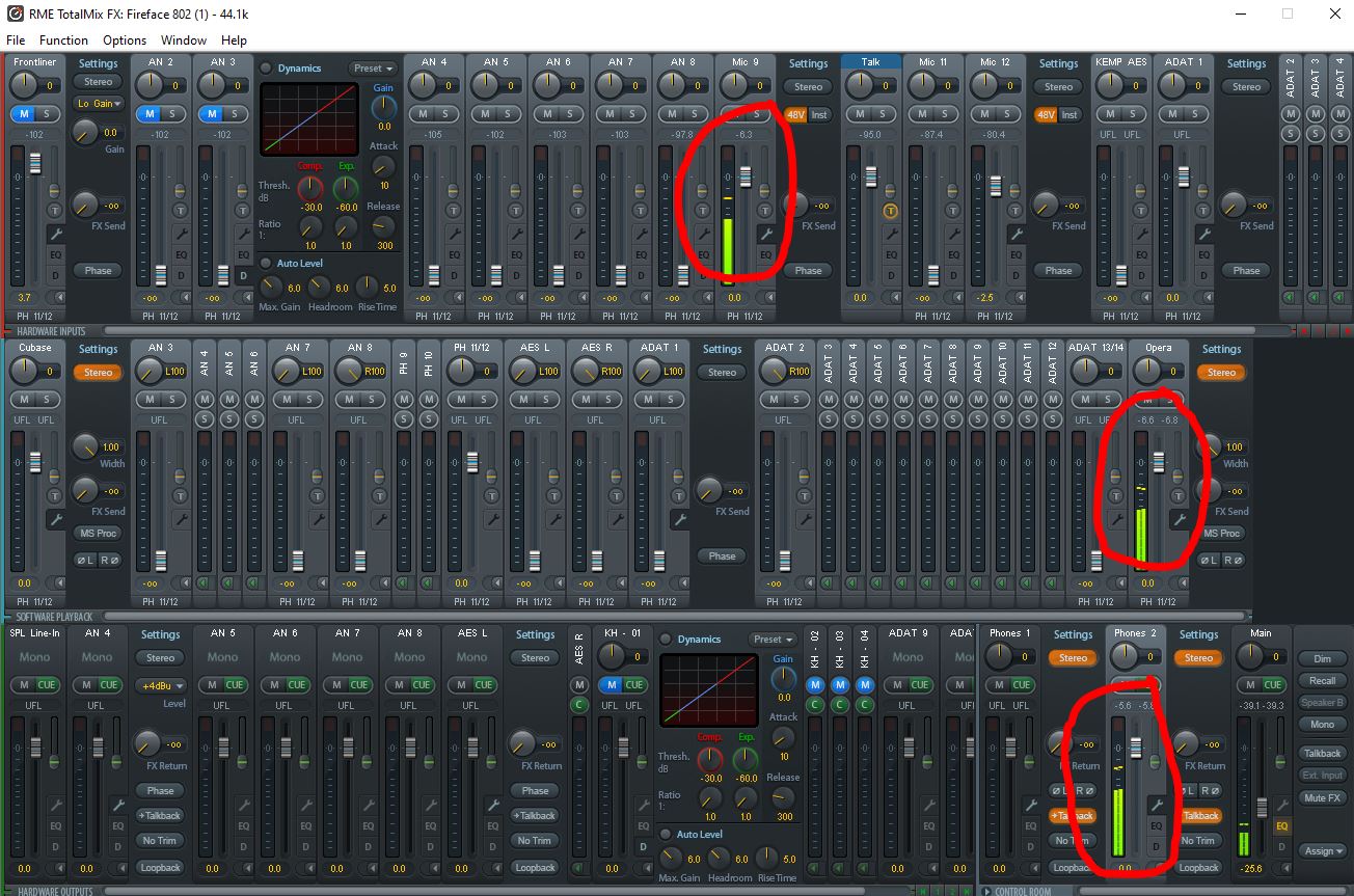In TotalMix steht der fader vom KH-Kanal auf unity.