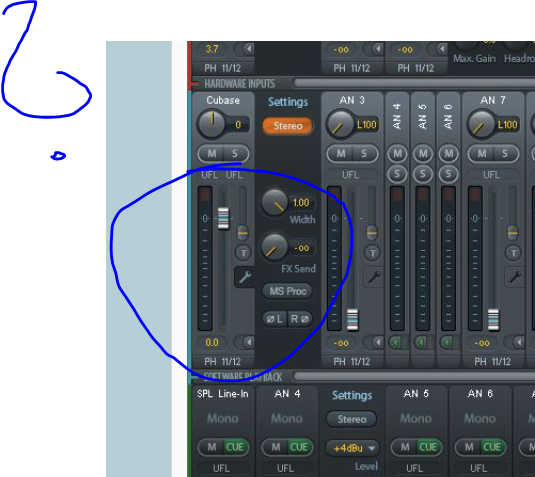 Das ist der Softwareplayback für AN1/2. Wenn sie den nicht hochzieht, hört sie nichts, was aus Cubase kommt.Warum ist der Cubase-Regler hochgezogen?