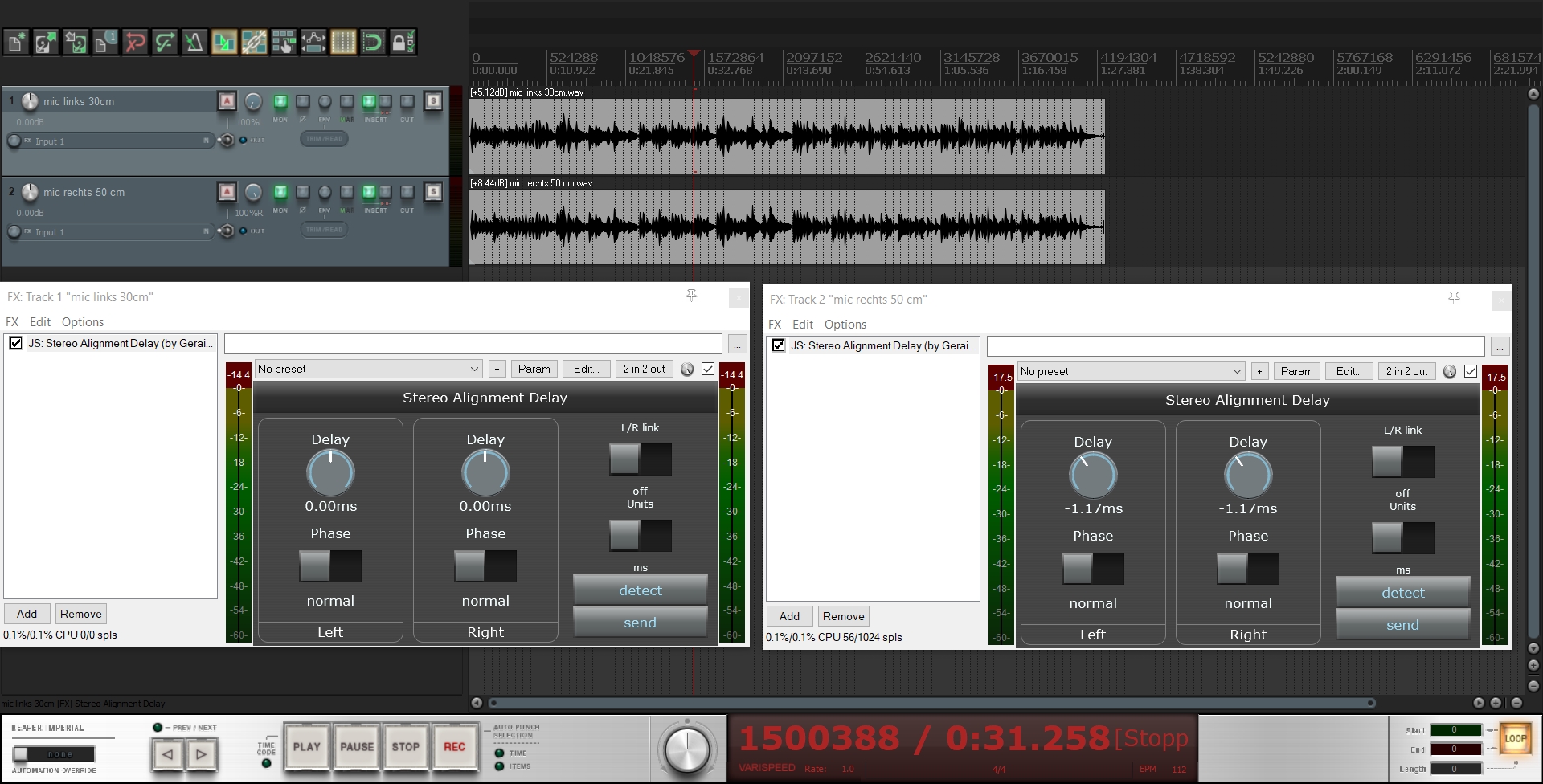 Hallo, mir geht es vor allem um die Aufnahme einer klassischen Gitarre mit 2 Mikrophonen (KM184). Wenn ich AB aufnehme ist es kein Problem, aber ich habe eine Aufnahme probiert, bei der ein Mic 30 cm auf den 12. Bund zeigt und das andere von oben in Ohrenhöhe (Enpfehlung von Jonas Wagner (recording-blog auf yt). Da gibt es so ca. 20 cm Unterschied. Ich probiere verschiedene Mikrophonierungen aus, solange beide mic die gleiche Entfernung von der Gitarre haben ist es kein Problem.Vielleicht schreibt der Threadersteller nochmal genauer, worum es ihm eigentlich geht. Wenn es um das fixen von Stereospuren geht, scheint das MAutoStereoFix auch interessant zu sein: