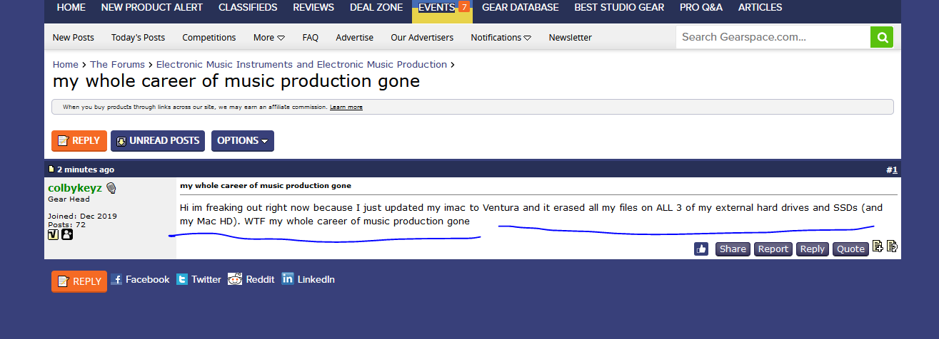Hi im freaking out right now because I just updated my imac to Ventura and it erased all my files on ALL 3 of my external hard drives and SSDs (and my Mac HD). WTF my whole career of music production gonegearspace.com