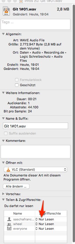 Danke an alle. Bin bei ProX Anfänger, ist gleich bischen viel für mich. Wie deaktiviere ich aber nun den Schreibschutz und woran sehe ich, daß die Datei geschützt ist. Sieht man das nicht, in der geposteten Größe meine Screenshots? Wenn ich das Bild anklicke erkennt man bei mir alle Details auf meinem Monitor. Wenn die Voreinstellung in Logic ProX "schreibgeschützt" ist, ist das ja blöd. Mir gehört der Rechner und die SW, mir gehört das Projekt und die Datein. Da hätte ich doch angenommen, man hat Schreibrechte.