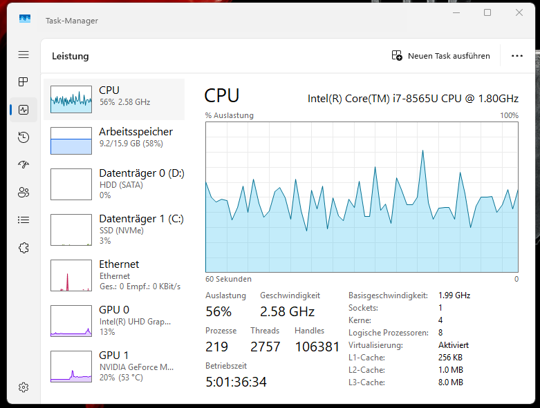 Ich habe jetzt mal den Taskmanager gefragt. Der sagt dass ich mit der DAW grade mal 9GB RAM brauche wenn ich ein Projekt mit 49 Spuren (Midi und Audio) laufen lasse. Die CPU Auslastung schwankt so zwischen 40 und 75%.