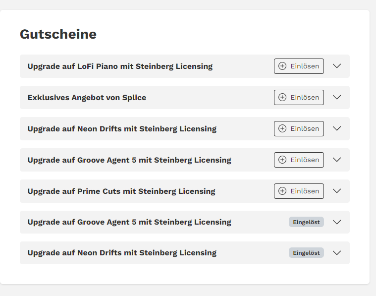 Ja diese Produkte habe ich mir alle vor der Umstellung auf das neue Lizenz System gekauft. Das sind: Groove Agent, Prime Cuts und Neon Drifts. Seltsam ist auch, dass von Groove Agent und Neon Drifts Gutscheine doppelt bereitstehen, wie du auf diesem Screenshot sehen kannst. Ich nehme an, dass Steinberg diese Lizenzen für zwei Rechner bereitstellt.