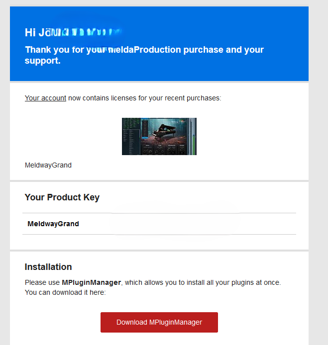 den Product Key finde ich nur in meinem Melda Account, wenn ich mit dem Browser im Internet surfe. Von da soll die dann per Drag and Drop ? Wenn ich über den Product Key mit der Maus gehe, rührt sich nichtsm "Tote Buchstaben und Zahlen".Komisch, denn derartige Probleme habe ich mit Melda nie gehabt. Die Eingabe der Seriennummer (im MPluginManager) via Drag & Drop finde ich zugegebenermaßen etwas gewöhnungsbedürftig, aber funktioniert hat es bisher immer.