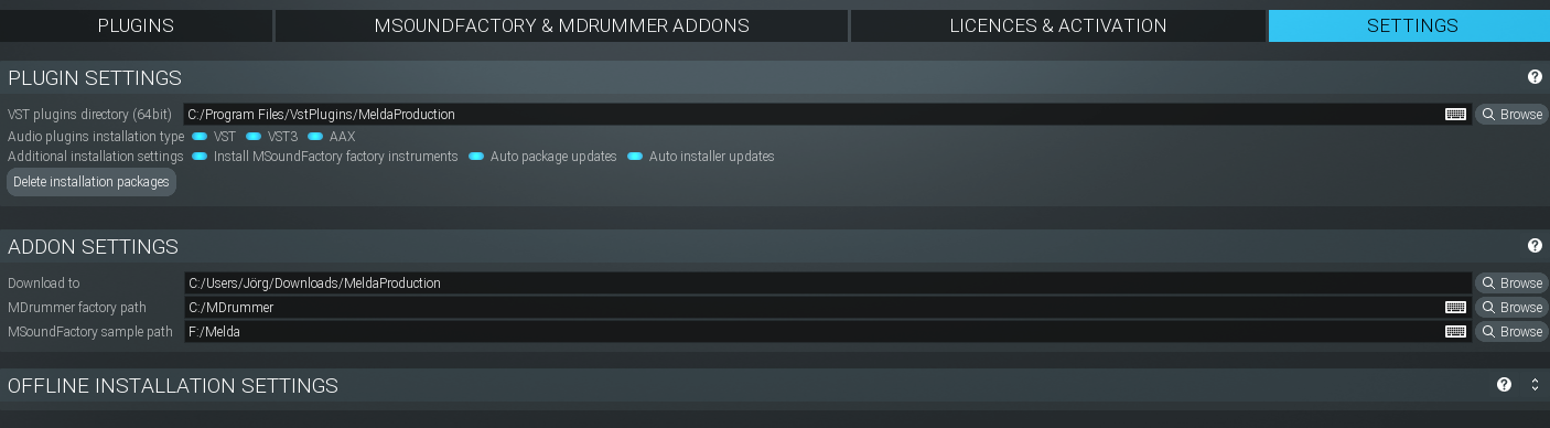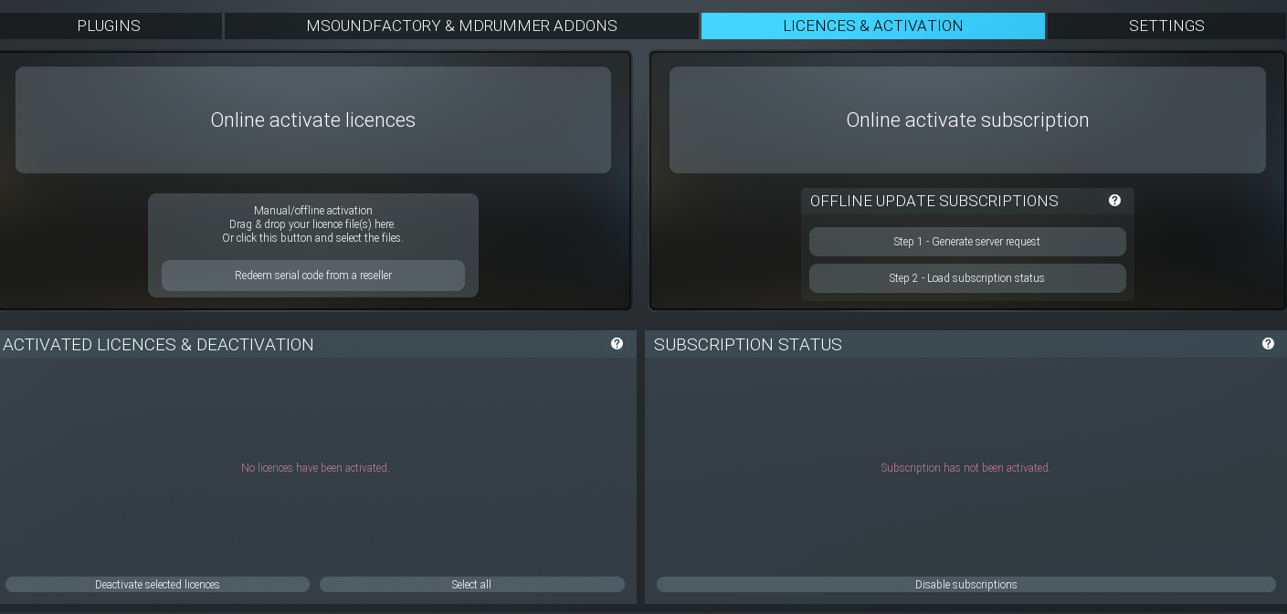 Du musst Dich in diesem MPluginManager zunächst mit Deinen Accountdaten anmelden. Ich gehe davon aus, dass Du das gemacht hast. Dann klicke (bei aktiver Internetverbindung) unter "Licences & Activation" oben links auf "Online activate licences". Dann sollten links unten Deine Lizenzen auftauchen. Dann oben links auf "Plugins", dort die MSoundFactory installieren und unter "MSoundFactory & MDrummer Addons" den Meldway Grand installieren.