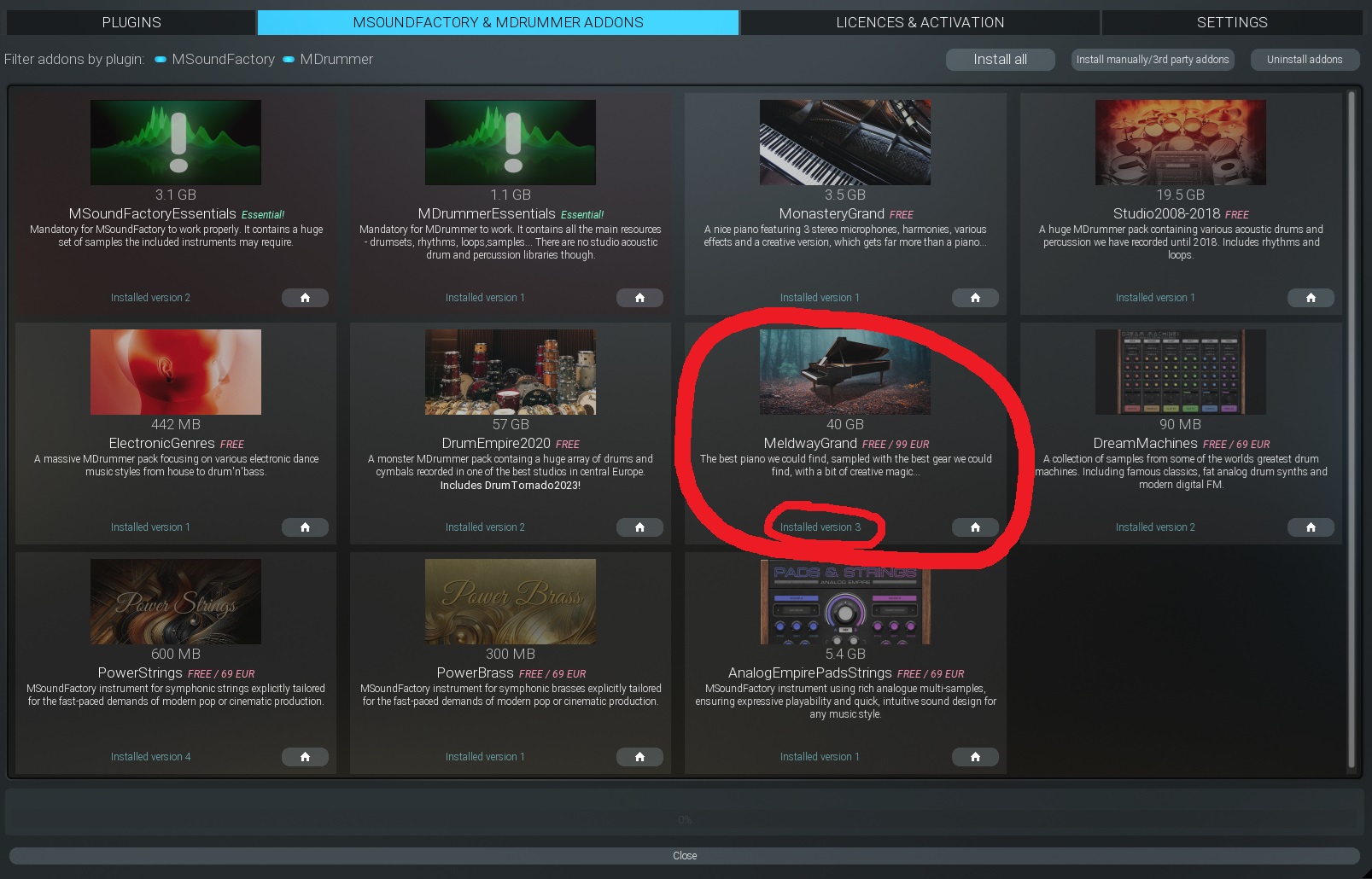 Hab ich auch kurz gedacht. Aber dann würde doch das MeldwayGrand gar nichts machen und ließe sich noch nicht mal laden, wenn mich nicht alles täuscht. Daher kann das irgendwie nicht sein. Aber die Frage ist schon berechtigt.So wie ich es verstanden habe, hat er das MSoundFactory nicht installiert. Aber das ist ja zwingend, damit das Piano geht.